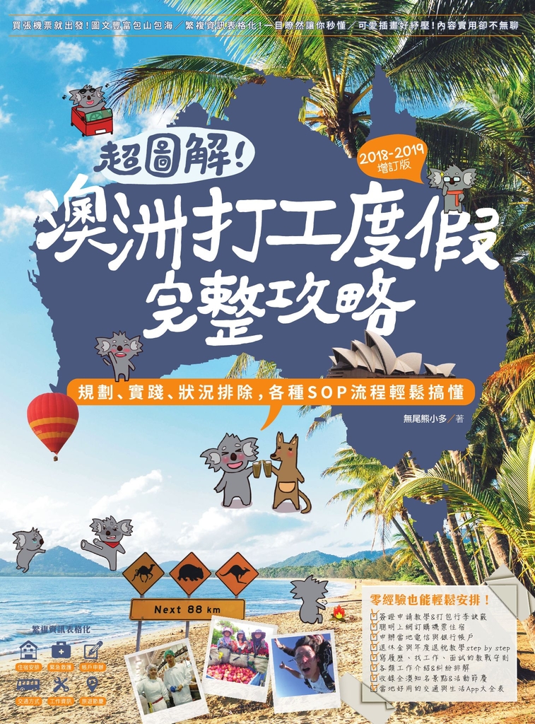 內容簡介 澳洲打工度假(2018-2019增訂版)★覺得台灣薪情差、想跳出舒適圈,不如就去澳洲打工兼度假吧!★除了賺到一桶金,接觸各國人士、累積英語能力、快速拓展視野的國際觀更是值千金!從零基礎逐步教你簽證、打包行李、安排機票住宿、寫履歷面試到吃喝玩樂樣樣通!詳盡介紹各類工作內容、標出語言技術的難易度,並一次收錄多位資深打工者經驗談,讓你找工作不心慌!除了將各種資料整理成精闢易懂的表格、還輔以可愛插畫與近千張當地照片,讓繁複資訊不沈重!Chapter 1 澳洲簡介&簽證介紹篇:概述澳洲地理環境與文化背景,出發前該做的自我檢視、逐步教學澳洲簽證申請流程與二簽的門檻規定Chapter 2 行前準備&入境海關篇:從資金準備、行李打包訣竅到預定機票住宿一次傳授Chapter 3 落地安頓&申辦帳戶篇:抵達澳洲後須申辦的電信網路、銀行帳戶及TFN稅號完全解析,並詳細教學退稅、健保與退休金等相關問題Chapter 4 當地生活&食衣住行篇:介紹當地公共設施與住宿類型,以及各種大眾交通工具一覽,教你如何在生活起居上精打細算Chpater 5 如何找工作&職業介紹篇:從寫履歷表、面試完整經驗傳授,並廣邀各界背包客分享農場、肉廠、旅館、餐廳、賭場及特殊專業工作的實際經驗Chpater 6 當地旅遊&吃喝玩樂篇:從雪梨、墨爾本、布里斯本、凱恩斯、黃金海岸到首都坎培拉,以及達爾文、愛麗絲泉、阿德雷德、伯斯,完整收錄澳洲全國各大城市的旅遊資訊