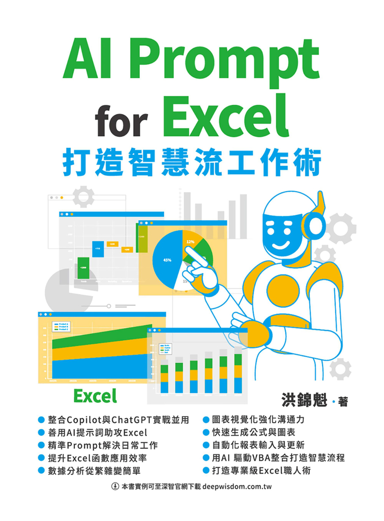 內容簡介 【讓AI成為你的Excel智慧助理,創造無限可能!】【立即入手,跟上數位辦公革命第一線!】◎內容重點★ AI結合Excel的實戰應用從AI學習環境、Excel不同版本的AI運用開始,說明如何利用ChatGPT、Copilot等AI平台輔助Excel學習與工作流程,並深入講解AI輔助的資料分析、公式設計、數據視覺化及自動化D139-DM2555-0619 。★Prompt(提示詞)設計全面教學系統性解說Prompt的基本概念、設計語法、實作技巧,並提供大量範例,幫助讀者將自然語言需求快速轉化為AI可執行的Excel指令,有效提升資料處理與自動化效率 。★涵蓋Excel全核心功能內容從數值、文字、邏輯、查詢、日期、統計等函數,延伸到VBA自動化,逐步教學如何用Prompt強化各項Excel功能,並以大量案例實作說明 。★ 進階應用與職場實戰專章介紹財務模型、資料自動化、流程整合、進階圖表、商業報表等情境,並配合AI工具與最新資源,強化實務操作力,讓讀者真正成為「Excel+AI」的職場高手 。★ 建立AI職場競爭力強調如何讓AI成為你的「虛擬助理」,解放繁瑣重複的Excel工作,把重點放在高價值決策與創意發揮,帶領你在智慧職場脫穎而出 。◎特色◇全台唯一AI Prompt + Excel整合教學專書。◇實用範例豐富,從新手到進階皆適用,附Prompt設計範本與練習。◇一次學會ChatGPT、Copilot、Gemini等主流AI平台在Excel的應用。◇同步涵蓋自動化、資料清理、數據分析、財務建模與VBA實作應用。◇學習資源完整,附線上範例檔案及社群交流資源,讓學習不中斷。◇職場實用導向,每章皆有職場案例與應用,培養智慧工作力。◎學習目標 - AI智慧流,讓Excel成為你的專屬數據助理!你還在用傳統方法處理Excel嗎?《AI Prompt for Excel:打造智慧流工作術》全面升級你的資料分析與自動化工作流!◇用一句Prompt,AI幫你自動完成報表、公式、圖表與數據清理◇不會VBA、不懂複雜公式,也能靠AI成為Excel達人◇專為現代職場設計,涵蓋ChatGPT、Copilot、Gemini等熱門AI平台◇全方位案例演練,涵蓋財務、行銷、數據視覺化、報表自動產生◇下載即用範例,社群互動資源豐富從資料分析師、財會人員到業務、行政與教育工作者,本書都能助你省時省力,大幅提升數位競爭力!