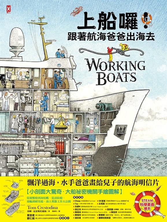 內容簡介 一本能讀上百次的海上冒險圖鑑!∞|每頁都埋藏無數小驚喜|∞故事+知識+驚喜小小朋友一看就停不下來,一讀就變身小小船長!▋小剖面大驚奇.大船祕密機關手繪圖解▋♥飄洋過海~水手爸爸畫給3歲兒子的航海明信片本書作者湯姆身兼船員、畫家與工程師,在離家出海工作的日子裡,他太想念遠方的兒子了。於是,他把對兒子的思念,畫成一本航海明信片。每一張圖裡,都藏著爸爸的知識,也藏著對兒子的想念。畫裡有各種大船的剖面圖,有正在閱讀、寫詩、下網捕魚、繪製海圖的水手,還有路過的虎鯨、鯨魚、海豚......各種海洋生物。透過這些畫,湯姆終於能夠一直陪在兒子身邊,讓兒子看見自己在海上的工作和生活!★哪種魚餌的味道,最能吸引帝王蟹?為什麼帝王蟹捕撈船的船艏,設計得非常高聳?★在科學研究船上工作,需要擁有哪些技能?★Mayday!Mayday!Mayday!對講機傳出這三個字時,代表什麼意思?★想知道海底地圖是如何繪製出來的嗎?★零下40度的魚艙,漁民要如何防鮭魚凍傷?★為什麼大比目魚的雙眼長在同一側?這樣特殊的生理結構,必須使用哪種釣魚方法?★救生筏如何自動充氣?噴射引擎如何讓船隻倒退?✔ 10艘最壯觀的海上工作船,一次看個夠!整本書就像一部海上探險寶典,從英勇的海岸巡防艦、滅火高手消防船、阿拉斯加的刺網漁船,到美國科學研究船,每艘船都有不一樣的祕密任務,快來成為小小水手,學習分辨各種海上英雄!✔ 神祕船艙裡藏什麼?大船立體剖面超圖解作者彷彿把整艘船「剖開」一般,呈現出船隻由大至小的各式機關,帶你進入駕駛試、船長室、魚艙、機艙、製圖室、實驗室、健身房和廚房,探索船上的每一個角落。✔ 跟著船員出海,體驗有趣的航海生活!這不只是一本介紹大船的書,還帶著孩子了解船員的工作&日常:捕魚、維修機器、煮飯、導航、寫詩(沒錯,船員也會寫詩!)原來在海上生活這麼精彩!✔ 邀請台灣船舶專家&漁業專家審訂確保內容知識正確無誤,讓孩子家長讀得開心也放心。✔ 知識量爆棚,小朋友永遠看不膩!用簡單易懂的語言+比喻法,解釋各種特殊漁法,並教導如何閱讀航海圖;還有各種安全救生裝備、雷達、引擎、傳動系統、救生筏、升降滑輪……的設計原理,滿足熱愛科普知識的所有小小讀者!✔ 超精美扉頁設計,手繪航海繩結作者手繪19種海上工作常用的繩結,包括:牛結、貓爪結、水手結、雙套結……,孩子也能拿起繩子,照著圖片步驟,一起玩繩結!【媒體好評推薦】.「所有對海洋世界感到好奇的男孩、女孩以及大人,都能從Tom Crestodina的手繪圖中,收穫許多樂趣,與一籮筐的內幕知識!」──《紐約時報》(The New York Times).「如果一張圖片值千言,那麼湯姆如此精細的剖面圖至少能傳達五千言。對任何熱愛航海的人來說,無論8歲還是80歲,這本書都能一次滿足!」──《National Fisherman》.「這是一本既具知識性又充滿樂趣的讀物,適合對大船及其運作方式感興趣的讀者,書中細節一定能深深吸引他們。」──美國圖書館協會《Booklist》.「如果你的孩子對故事不感興趣,卻熱愛非小說類書籍──尤其是探究船隻的運作──這本書會是絕佳的禮物。」──《蒙特婁公報》(Montreal Gazette).「這本書是孩子最棒的學習材料,對父母而言也是。精緻的插圖能吸引剛開始閱讀的孩子,隨著孩子閱讀能力的提升,他們就能更深入翻閱細節的內容。整本書的設計也很吸引成年人。」──《安克拉治每日新聞》(Anchorage Daily News).「書中涵蓋大量剖面圖,細節非常豐富。」──《科克斯書評》(Kirkus Reviews)
