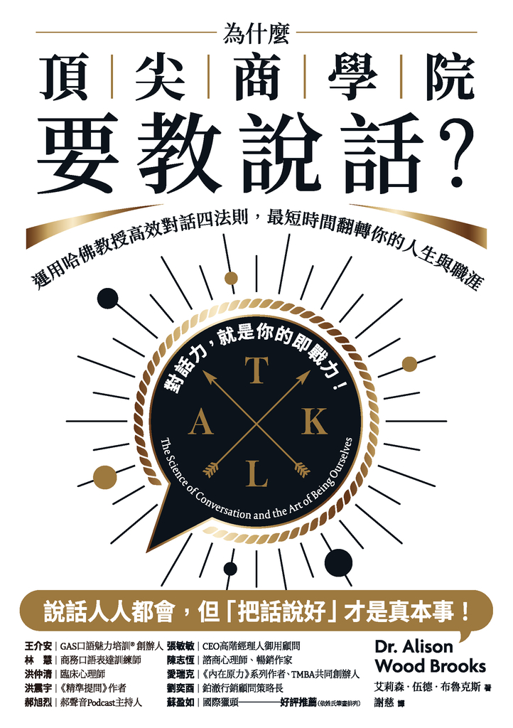 內容簡介 ★說話人人都會,但「把話說好」才是真本事!★用本書,成為真正會說話、敢說話,讓人願意聽你說話的人哈佛最受歡迎的對話課,上千名學生搶修、企業內訓指定教材——首度完整公開!《重啟人生》作者亞瑟・布魯克斯、《恆毅力》作者安琪拉・達克沃斯眾多重量級作家一致推薦「說好」!一句話能帶來信任,也可能瞬間冰封關係。我們花一輩子說話,卻不見得知道:「怎麼說才會有人願意聽?」「我是不是說錯話了?」「怎麼又冷場了……」「我只是想表達自己,為什麼聽起來像是在吵架?」這些情境,你是不是再熟悉不過?我們每天花大量時間在對話中,開會、交友、道歉、提案、安慰別人,卻時常覺得自己「說不好」——不是語塞,就是被誤會;不是太強硬,就是太軟弱。作者結合語言哲學、行為經濟學與社會心理學三大領域,帶我們看見對話的全貌──看懂關係、理解脈絡,並在最關鍵的時刻,用對的語言,帶來改變。▲用 TALK 四原則,打開對話的真正力量書中不教說服、攻防或話術,而是以心理學與行為科學為根據,為我們展現「說話的本質」,其實是一連串「看不見的選擇」:說與不說、何時開口、選什麼話題、用什麼語氣、回應或沉默……每一秒都在決定關係的走向。因此,作者提出一套實用且可訓練的方法論──TALK 對話架構,幫助我們有意識的打造每一場「說得好」的對話:T(Topics):備主題,對話持續不句點→ 話不投機半句多?選錯話題比冷場更致命。A(Asking):會提問,才有深度交流→ 發問會讓自己顯得無知?用提問才有機會打開對方心房。L(Levity):拋幽默,解尷尬,創連結→ 氣氛沉悶怎麼救?一句笑語,讓對話回到正軌。K(Kindness):用善意,建立信任與理解→ 意見相左如何表達不傷人?真正有力的回應,是善意。▲從聊天到衝突,對話高難度場景全收錄✓如何說出「讓人聽得進」的道歉?✓面對意見對立,如何不再吵架而是真心對話?✓被人踩到地雷怎麼反應?情緒高漲怎麼回到正題?✓當關係瀕臨決裂,還適合繼續說嗎?這不只是教說話的書,更是讓我們成為更好自己的指南。透過一場又一場微小但真誠的對話,將會找到屬於自己的位置,也重新建立起與這個世界的關係。國內名家一致推薦王介安|GAS口語魅力培訓® 創辦人林慧|商務口語表達訓練師洪仲清|臨床心理師洪震宇|《精準提問》作者郝旭烈|郝聲音Podcast主持人張敏敏|CEO高階經理人御用顧問陳志恆|諮商心理師、暢銷作家愛瑞克|《內在原力》系列作者、TMBA共同創辦人劉奕酉|鉑澈行銷顧問策略長蘇盈如|國際獵頭──大力推薦(依姓氏筆畫排列)國外好評推薦「在本書中,艾莉森・伍德・布魯克斯結合多年哈佛商學院的研究成果,深入分析假釋聽證會、聯誼約會、業務通話與日常閒聊,抽絲剝繭出高效溝通的關鍵。她的筆觸親切自然,也不避諱指出對話本身的荒誕與混亂──『說話本就複雜,好好說話更是如此』。」──《紐約時報》「閱讀這本書就像在與全世界最會聊天的人對談。艾莉森用溫暖、同理與喜悅,讓對話這門科學變得鮮活有趣。本書讓我在對話上的表現大大提升,我已經推薦給我認識的每一個人。」──安琪拉・達克沃斯,《恆毅力》作者「本書是少見集『聰明、知識、實用』於一身的閱讀饗宴,樂趣遠超出預期。我們應立刻將書中的新觀念應用在朋友、家人、客戶與同事身上,從此改變我們對『真正對話』的想像。」──席拉・西恩、道格拉斯・史東,《再也沒有難談的事》作者「對許多人來說,對話似乎是這個時代中逐漸消失的藝術。本書提供了完美解方。讀完這本書,你的生活會變得更好。」──亞瑟・C・布魯克斯,哈佛教授、《重啟人生》作者「這是一本邏輯清晰、筆調俐落又超實用的溝通指南。艾莉森提供大量實證研究、工具與模型,幫助你成為更好的領導者、伴侶、父母、同事與朋友。這本書必讀無疑。」──丹尼爾・科伊爾,《成就密碼》作者「行為科學界的明星學者艾莉森・伍德・布魯克斯,在這本書中教我們如何讓對話更有溫度、更有深度。書中充滿機智、科學力與精彩故事,是一部當代經典之作。」──伊森・克羅斯,《強大內心的自我對話習慣》作者「這本書融合研究、趣聞、實例與建議,教你如何讓自己被聽見、傾聽更深入、避免尷尬冷場、與他人相處更融洽──只要你曾經開口說話,本書就是為你寫的。」──比安卡・博斯克(Bianca Bosker),《看圖說畫》(Get the Picture)作者「這是一本兼具嚴謹實證與閱讀樂趣的對話指南,由該領域最具代表性的學者撰寫,實屬難得。」──艾蜜莉・奧斯特,《兒童床邊的經濟學家》作者「布魯克斯輕鬆幽默的寫作風格,無論是對話研究專家還是從未聽過對話分析的新手,都能一讀上癮。」──《Booklist》「從聯誼現場、業務溝通到假釋審查,作者以大量真實資料,帶領讀者了解成功對話的關鍵要素。本書深入淺出、具體可行,為人類溝通之謎揭開一角。」──《出版人週刊》