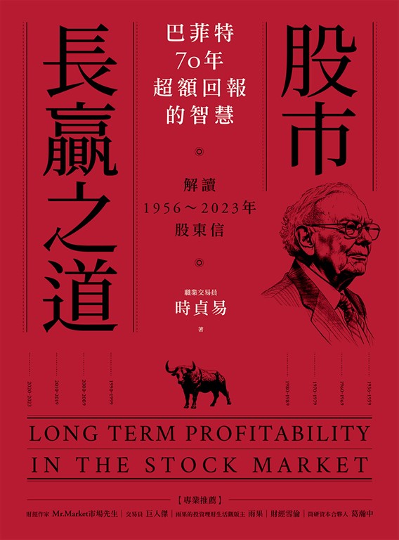 產品目錄 推薦語前言1956年 在貪婪與恐懼中,堅守價值投資1957年 每年平均擊敗市場10%1958年 滾起來的投資雪球1959年 遇見終生合夥人查理.蒙格1960年 最大重倉股實現翻倍1961年 股神的三種主要投資策略1962年 不猜測市場走勢1963年 無視恐慌事件,市場繼續暴漲1964年 重倉抄底股價腰斬的優質企業1965年 唯有專注才能產生價值1966年 買到錯的公司,就像在買遊艇1967年 看不懂的生意,我就不買1968年 通膨來襲,股票價值備受考驗1969年 錢,只是一張計分卡1970年 波克夏.海瑟威時代開始1971年 買下《華爾街日報》,躋身政商兩界1972年 投資致富的第一步,是當一名優秀企業家1973年 買下陷入困境的傳媒巨頭1974年 以「菸蒂股」價格買入優質成長股1975年 差點被證券交易會起訴1976年 買下保險公司,得到浮存金1977年 巴菲特的選股指標是……1978年 沒人能成功預測短期波動1979年 別把時間浪費在壞公司上1980年 無論貨幣、政策如何……核心還是企業本身1981年 用激勵和信任,讓員工提高效率1982年 議價權,在品牌價值手上1983年 反對只重「價格」而輕「價值」的操作1984年 維護股東權益不只是口號1985年 別再修補那艘破船1986年 股票表現,不可能永遠超過公司本身1987年 大盤單日閃崩20%,巴菲特從容應對1988年 用筆偷錢,比用槍搶劫還容易1989年 投資必須簡單易懂1990年 樂觀,是理性投資者的敵人1991年 買入價格取決於未來獲利能力1992年 以合理的價格買進好公司1993年 聰明投資人,懂得利用波動1994年 首先,你要選中一顆好球1995年 拿下GEICO1996年 不願意抱10年,那連10分鐘都不要擁有 1997年 逆市賣出1998年 好的理念+好的經理人=好的成果1999年 不買高科技股票的原因2000年 投資與投機,只有一線之隔2001年 如何面對全球市場的劇烈動盪2002年 想成為贏家,就必須與贏家共事 2003年 波克夏的獨立董事制度2004年 別把事情搞得太複雜2005年 如何判斷泡沫的信號?2006年 辨認低的柵欄,並遠離高的柵欄2007年 偉大的公司,都至少有一道護城河2008年 美國次貸危機下的投資邏輯2009年 選擇債券,是因為可以睡得更安穩2010年 次貸危機近乎結束,世界會變得更好2011年 抓住那些離譜的低價機會2012年 別再用電腦研究那些「率」2013年 拜訪企業後,就知道該不該買入2014年 建構波克夏的每股內在價值藍圖2015年 巴菲特的兩個失敗案例2016年 估值不過高,重倉買入蘋果公司2017年 不要借錢投資股票2018年 美中貿易戰開打,波克夏尋找收購機會2019年 複利的力量2020年 全球市場閃崩後復甦2021年 不選股,而是選業務2022年 投資的真相2023年 功成不必在我,而功力必不白費跋