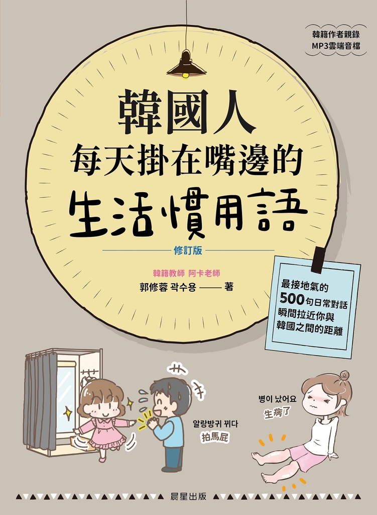 產品目錄 推薦序 林秀霞(上繽獅子會創會長)推薦序 楊智民(英語格林法則研究專家)作者序 使用說明 韓語40音第1章 韓國人每天掛在嘴邊講的100句001 안녕 가세요 再見002 다녀오겠습니다 我要出門囉003 오랜만이에요 好久不見004 잘 먹겠습니다 我要開動了005 주말 잘 보내세요 週末愉快006 수고셨습니다 辛苦了007 먼저 갈게요 我要先走了008 죄송니다 對不起009 실례지만... 請問……010 뭐라고? 你剛剛說什麼?……第2章 韓國人日常生活會用到的150句101 걱정이 산이다 煩惱多、心事重重102 그냥 아는 사람이에요 只是點頭之交而已103 그냥 보는 거예요 我只是看看而已104 생각보다... 比我想像中的還要……105 그러지 말걸 我不應該這樣的106 귀를 의심다 懷疑聽錯 107 조금밖에 못요 我只會一點點108 저 아세요? 我認識你嗎?109 시나 서요 我只是好奇而問110 내가 알기론... 據我所知…………第3章 韓國人應對回答時常說的150句251 꼴 보기 싫어 連看都不想看到252 그때 그때 달라요 不一定253 그럴 수도 있겠네요 或許真的是這樣254 잘 모르겠는데요 我不是很確定255 내가 어떻게 알아? 我怎麼知道?256 저도 그 얘기 들었어요 我也有聽說257 못 참겠다 受不了258 무슨 꿍꿍이야? 在搞什麼鬼?259 또 시작이야 他又來了260 못 믿겠어 我無法相信…….第4章 韓國人表達感情和狀態的100句401 기대돼요 好期待402 시원다 爽快403 즐겨... 喜愛……404 멍 때리고 있었어 在放空405 적당 라 夠了沒406 손에 땀을 쥐다 捏一把冷汗407 불난 집에 부채질다 火上澆油408 말들이 많아요 議論紛紛409 시간 가는 줄 몰랐어 太沉浸忘記時間410 말만 잘 只會說….讀者迴響