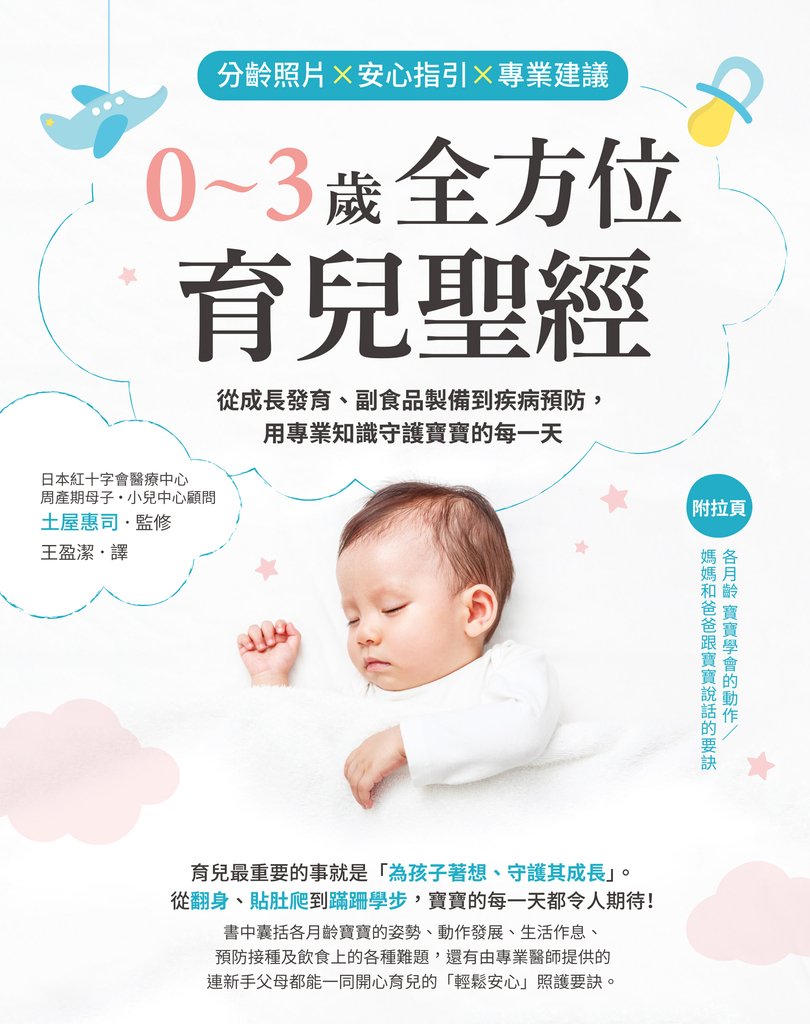 內容簡介 簡單易懂‧輕輕鬆鬆的安心育兒指南為了356天全年無休育兒的新手父母由專科醫師依照月齡提供簡單易懂‧輕輕鬆鬆的安心育兒指南 嬰兒不會說話,不論什麼都是透過哭來表達。 儘管媽媽或爸爸都為了理解寶寶做了種種嘗試,但一開始可能都不得要領。 不過沒有關係,各位媽媽和爸爸都是育兒新手,不得要領是理所當然的。 每天和寶寶一起生活,從聲音或哭泣的方式、肢體動作等等,漸漸地就會了解寶寶想表達什麼。 育兒最重要的事就是「為孩子著想、守護其成長」。 本書介紹了各月齡的寶寶會做的動作、生活作息舉例、成長及發展上擔憂的疑問, 從發育、發展的狀態、哺乳的時機到睡覺的時間,了解寶寶的全貌。 並且還特別提出「這個時期媽媽的狀態,和寶寶相處的方式」、「這個時期的爸爸應努力的事項」, 再加上能放鬆心情「輕輕鬆鬆」、「安心」育兒的要訣。 最後還列出「應先了解的嬰兒疾病」與「緊急程度確認表」, 解說關於感冒或腸胃炎等嬰兒容易罹患的主要疾病其症狀、治療法、居家照護, 如果寶寶的狀況變差時,也可以作為是否就醫的判斷基準。 希望有助於讓媽媽和爸爸與寶寶相處的每一天,既充滿期待又能安心育兒。 ●與新冠病毒共存時代的育兒Q&A Q玩具最好也殺菌、消毒嗎? A首先是大人不要把病毒帶入家中 首先,外出的大人不要把病毒帶入家中。回家後,請徹底洗手和消毒。其次,寶寶可能會舔或放入口中的玩具則要定期清洗等,留意其清潔。離開人體的病毒並無法存活很多天,因此在一般的注意範圍內應不需要太擔心。 Q寶寶也需要戴口罩嗎? A未滿2歲反而危險 未滿2歲的話,戴口罩反而危險。由於嬰幼兒的氣管狹窄,一旦戴了口罩會難以呼吸,也可能造成心臟的負擔。此外,也被指出有窒息及中暑的危險,還有難以察覺寶寶的臉色或表情變化等缺點。2歲過後才可配戴為預防感染的口罩。 Q嬰幼兒健檢和預防接種往後延比較好? A盡可能依照預定時程接種 新冠病毒流行期間,有些人會擔心是不是最好避免為了嬰幼兒健檢、預防接種而外出。然而,為保護寶寶的健康,把這些往後延才是問題。太晚發現其他重大疾病,或是增加致命傳染病的風險這些都有可能。因此請依照時程接種,不要延遲。 Q居家時間如何消除壓力? A活用線上工具進行交流 越來越多媽媽因漫長的新冠疫情而備感壓力。無法外出時,不妨試著在影音網站等地方找找能和寶寶樂在其中的運動或唱遊。此外,透過線上工具和媽媽友交流也有助於消除壓力。如果這樣還是持續焦慮而無法成眠的狀態時,尋求健康服務中心(衛生所)這類專家協助也很重要。