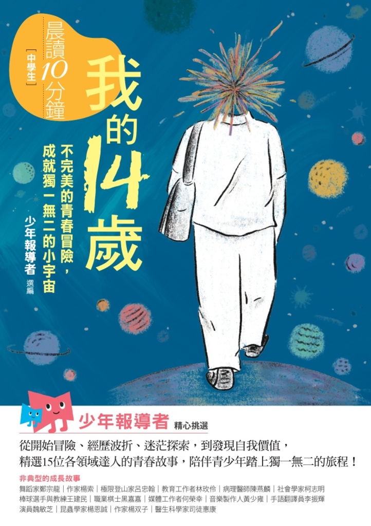 產品目錄 選編人的話 會有一個懂你的人 推薦文1 對十四歲的深情告白 推薦文2 如果你的小孩想看,我願意買給他。你想看,更好! 第一章 冒險是成長的開始 引言 鄭宗龍:我只是去上廁所,卻墜進「神祕世界」的入口 楊索:那年,我買了一張通往異想世界的單程車票 呂忠翰:打赤腳登上人生第一座百岳,和山成為交往一輩子的「好朋友」 第二章 命運也許不好玩 引言 林玫伶:戲院、賭場、檳榔攤,我生命的另類養分 陳燕麟:被一個「沒有藥可醫的病」找上,讓我成了不停尋找解方的那個人 柯志明:為了見白色恐怖入獄的爸爸,我把一整本的《新英文法》讀完 第三章 這就是愛的感覺 引言 王建民:一條等待後勁的抛物線 黑嘉嘉:不愛芭比娃娃、只愛《棋靈王》,塔矢亮教會我專注當下每一步 何榮幸:我希望,那一年沒有得到愛國作文比賽冠軍⋯⋯ 第四章 不懂也沒有關係 引言 黃少雍:不嚴肅成長紀念冊──啊,人生原來是這樣呀? 李振輝:替聾人「說話」,解開自己少年時代自卑感的心結 魏敏芝:主演了張藝謀的電影,讓我活成自己人生的「女主角」 第五章 尋找自己的星球 引言 楊恩誠:媽媽的小庭院和《讀者文摘》的書,帶我走進昆蟲的大世界 楊双子:閱讀和寫作,引我進入《七龍珠》的「精神時光屋」 司徒惠康:孤軍父親、養女母親,貧困沒能限制我的逐夢之路 企劃緣起 成長與學習必備的元氣晨讀