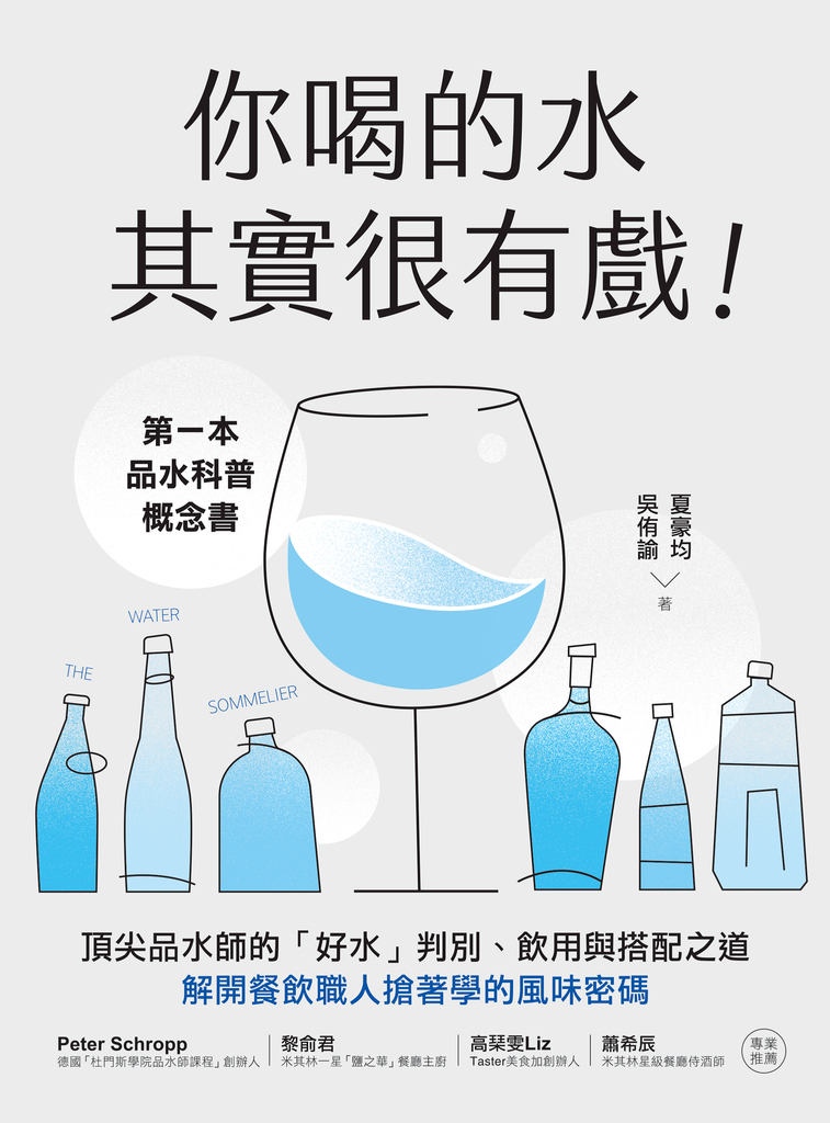 作者介紹 作者簡介夏豪均 Howard Hsia美國南加州大學教育博士,現任開平餐飲學校校務發展委員會主委、台灣侍酒師協會理事長、國際品水師協會大中華區代表。「Water Selection 品水師嚴選」與「開平品水師國際證照課程」創辦人,亦擔任 Fine Water Society - Taste & Design Awards 評審、「尋找未來品水師挑戰賽」裁判長。深耕餐飲與教育領域數十年,始終堅持以人才培育為核心,關注全球餐飲產業的發展脈動。秉持「讓世界看見台灣,讓台灣走進世界」的信念,長年代表台灣參與多項國際餐飲論壇與教育合作計畫,積極推動台灣餐飲文化的國際交流,拓展教育與產業的全球視野。身為品水師,致力於將品水教學融入日常,倡導「豐富優質生活,首在嚴選好水」的理念。透過跨界整合與教育培訓,期許台灣餐飲教育走上世界舞台,並引領台灣在品水領域邁向國際頂尖,成為全球矚目的典範。吳侑諭 Yvonne Wu身為法律人卻對健康與營養懷抱熱忱。2017年前往德國杜門斯學院(Doemens Academy),考取國際品水師證照,成為台灣首位女性品水師。返台後擔任台灣首間礦泉水嚴選平台「Water Selection品水師嚴選」執行長,致力於推廣專業品水文化與正確飲水觀念。2018年起與杜門斯學院獨家合作,推出全球首創中文版「開平品水師國際證照課程」,迄今累積百餘場教學經驗,培育出全球第二多的品水師,讓台灣在國際品水領域占有一席之地。其專業深獲國際肯定,指派為國際品水師協會(Water Sommelier Union)大中華區代表,並受邀擔任台灣首屆「尋找未來品水師挑戰賽」裁判及台灣侍酒師協會(Taiwan Sommelier Association)專業顧問。結合專業知識與個人興趣,期盼讓更多人了解,水不僅是日常解渴的飲品,更能為健康加分、提升餐飲體驗,並為生活增添無限樂趣與可能性。