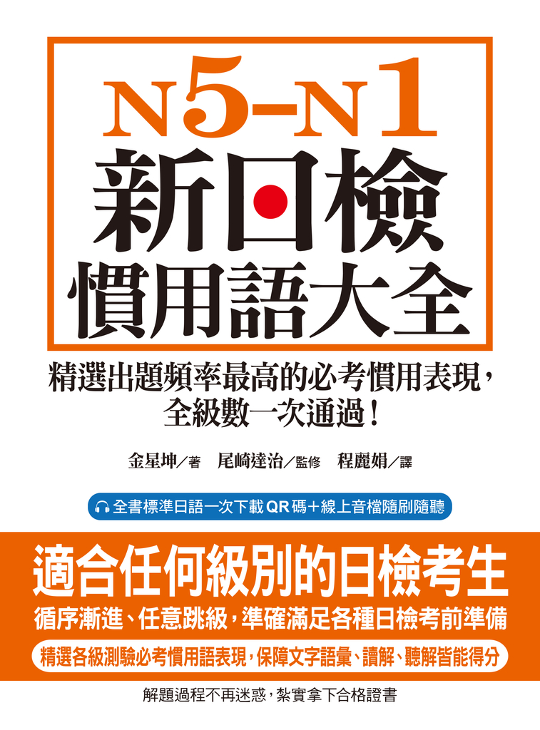 內容簡介 JLPT日本語能力測驗思考答題的必備最新概念書!搭配跨越級別的單字、文法書,讓你的日檢成績更上層樓!將日檢中常見,以日語單字搭配所形成的「慣用語」,以不同級數來分類收錄,並用30-60天的學習規劃。幫助你在任何日檢級數中,迅速理解測驗內容、攻克難題障礙結合單字基礎,進而保障文字語彙、讀解、聽解皆能得分你可以選擇循序升級或是任意跳級,紮實地達到JLPT測驗合格的日語實力!除了自我學習,老師也能用此教材輔助學生快速通過日檢*挑能拿分的先記,多記住一個就是多拿1分!日本語檢定考題分項眾多,不論是文字語彙、聽解、讀解、文法的考題,得分的關鍵都在於是否能夠精準「理解」。理解不足、理解錯誤,最終招致的都是拿不到分的下場,而且時間有限,考試期間沒有那麼多時間能夠慢慢理解。所以,「理解」的穩定度必須從考前就開始培養。然而,「理解」除了建立在能識別夠多的單字的基礎上外,這還不足夠。學過日語的人通常有種感覺,每個單字分開來看,十之八九都知道意思,但是當將複數的單字組合起來的時候,有時候雖清楚易懂,但有時候就讓人摸不著頭緒,這就是在關鍵的精準理解上出了狀況。會產生這種狀況是因為日語往往在兩個看起來不相干的單字,當它組成一個「慣用語」時,就可能會引申出另一個完全不一樣的意思。這就是單字背再多,也一樣拿不到分的要因之一。像這樣明明背很多單字,但卻因為不知道怎麼搭配使用而答錯題目、拿不到分,就讓人感到十分惋惜,本書正是為了解決考生們這方面的問題孕育而生。本書中,跳脫只背單字的框架,將許多應考必須知道的慣用表現,簡單如「家に帰る(回家)、会議が終わる(會議結束)…」的單純表現到困難的「琴線に触れる(觸動心弦)、ジレンマに陥る(進退兩難)、白羽の矢が立つ(萬中選一)、灯台下暗し(近身的事情反而搞不清楚、當局者迷)…」等較困難的表現皆大量收錄。這些日語複數單字組合出來的常用表達,或是進階的成語表達等「慣用語」,甚至於是日文的四字成語,將在書中按日檢級數完成分類,並以例句加深理解。透過對內容的練習,便可於考前充份培養精準的「理解」實力,順暢的閱讀題目並寫出正確答案。本書特色特色1:深入得分關鍵內容能集中且具體了解許多日語基本表現,另外更能了解慣用語及成語背後的實際意義,幫你擺脫背單字或寫試題時當機,不知如何是好的窘境。特色2:貼心的學習計畫表設計本書細心規劃出學習計劃表,只要按著書上的指示,學習每天需要學的慣用語量即可,適量的準備,N1花60天、其他級數30天內便達到一定的應考能力。特色3:以N5-N1清楚分級,想考哪一級的看主條目前面的分類指標就有本書一本全包、全級數通用更是本書的一大特點。書本的設計將各慣用表現依使用情境分類成八大類別,都是依N5~N1的級數列條目漸進,最符合一般的閱讀概念,當你考N3時,只要找尋在慣用表現的主條目前的「N3」標記就行了,能夠複習程度較低的慣用語,或者向後翻挑戰較難的領域表現。特色4:例句協助理解可能的出題模式書中每一組慣用語或成語都會附上例句,透過例句可以幫助你了解該慣用語可能在考試中被出題的形式。特色5:需要特別注意的部分會另附簡單說明部分慣用語或組成慣用語的詞彙若有比較特別的狀況時,會額外追加說明。以尚在N5程度的讀者為例,在慣用語講到「うちへ帰る」的時候,那個「うち」跟「家(いえ)」是相通的;又或如說明到「背広を着る」的時候,也會補上「現代比起「背広」,更多用「スーツ」」等的相關註解。特色6:不只慣用語,還有必知的短會話句部分會話中常用的句子「いってきます(我出門了)」、「光栄の至りだ(榮幸之至)」等也被收錄,並用這些句子再延伸出極短對話,一次便能精準掌握用法。特色7:清楚的假名索引全書出現的慣用語,在書後依五十音順序做假名索引,清楚易懂,方便好查。【QR碼音檔特色】本書的QR碼,將帶領你進入一個最有效、最新穎的學習領域。用聽到的來補強你所看得到的,變成最實際的得分。書中隨刷隨聽與全書一次下載的QR碼,不需註冊會員,或額外安裝自己不熟悉的播放APP才能聽。(註:打包下載檔案為ZIP壓縮檔,請先安裝解壓縮程式或APP再行下載,由於iOS系統對檔案下載的限制,iPhone用戶需升級至iOS 13以上,方可使用全書完整打包下載連結。)音檔特色更有以下的特點:純正日本人發音,你可以透過聽力加深對單字的熟悉度,並加強聽力的基礎,更同時學習到正確優美的日語音調。內容收錄所有的單字及例句的朗讀音檔。在學習時同步聽並跟著唸,即可以在最自然、道地的日語發音中加深印象,讓背誦不會那麼困難、達到良好的記憶效果。
