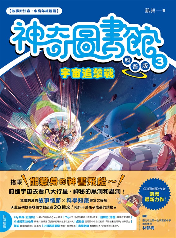 內容簡介 《口袋神探》作者──「故事大王」凱叔 超人氣兒童冒險故事系列最新力作《神奇圖書館》科普版,結合大冒險旅程+有意思的科學知識★~此系列故事收聽次數超過20億次!!陪伴千萬孩子成長的讀物~★翻開書,搭上能變身的「神書飛船」,這次前進宇宙去看所有星球啦收錄「我的科學筆記」,讓孩子進一步了解有趣又有料的小知識包含月球和太陽系的形成、星團與銀河、科普Q&A、科學家小故事【故事附注音、科學筆記附詳細圖解,中高年級適讀】◎『宇宙追擊戰』故事源起:有著長長白鬍子的凱糊塗老師上知天文、下知地理,孩子們最愛問他「為什麼?」,他班上的學生──吳天天、董曉雨、張小胖、鄭大海還有一隻名叫「括括」的貓咪,常搭乘老師的「神書飛船」到處探險。這天,空中突然降下「貓爪飛船」,喵星人不知為何把貓咪「括括」抓走了,科學小組趕緊搭上飛船到宇宙,展開拯救貓咪行動!慌亂之中,凱糊塗老師不小心開啟時空隧道,他們竟然到了火星基地,發現當下是2098年!科學小組為了追貓爪飛船,造訪宇宙所有的行星,過程驚險有趣……最後到達喵星人所在的卡特茲星球,那是個什麼樣的地方,他們能救回貓咪括括嗎?◆人類是如何搭火箭上太空的?來認識火箭的構造吧。◆宇宙的起源是什麼?恆星的顏色、亮度為何不同?◆火星、土星、天王星、海王星、水星上有哪些有趣的小祕密?◆極其神祕的蟲洞、黑洞的科學原理分別是什麼?◆月球是如何形成的?對於地球的巨大影響和周期性變化為何?◆來認識銀河系!包含恆星、星雲、星團以及暗物質的構成。《神奇圖書館-科普版》是集結冒險故事和科學知識的系列,專門為小學生量身打造生動又有趣的情節,加上圖文並茂的小知識單元,能激發孩子們對於科普的探索慾及好奇心,第三冊帶大家去廣闊的宇宙冒險。【我的科學筆記──認識星球的祕密、Q&A、科學家小故事】你是否好奇過,天上的星星藏著什麼樣的祕密呢?在附錄的科學筆記裡,把宇宙奧祕全都記錄下來啦。快來一起看看!人類是怎麼坐火箭上太空的、月球怎麼形成和進行周期性變化、太陽活動的進行、太陽系的形成、宇宙誕生和演化,在書中圖解說明。還收錄了科普Q&A,以及恆星天文學之父的科學家小故事。▌神奇圖書館(科普版)系列,共四冊 ▌1. 神奇圖書館(科普版):人體冒險隊2. 神奇圖書館(科普版):穿越恐龍世紀3. 神奇圖書館(科普版):宇宙追擊戰4. 神奇圖書館(科普版):變異植物危機▌書籍特色 ▌.畫風及場景生動,翻開書,隨時來場紙上大冒險!.故事附注音,孩子自己讀很容易,家長陪讀更好玩。.流暢又驚險的故事情節,讓小朋友很快就能記住科學知識。.收錄豐富的Q&A,能滿足孩子愛問「為什麼」的好奇心。.從故事學生活教育!了解浩瀚宇宙的源起,又如何和諧運作。