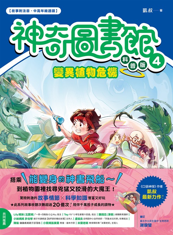 內容簡介 《口袋神探》作者──「故事大王」凱叔 超人氣兒童冒險故事系列最新力作《神奇圖書館》科普版,結合大冒險旅程+有意思的科學知識★~此系列故事收聽次數超過20億次!!陪伴千萬孩子成長的讀物~★翻開書,搭上能變身的「神書飛船」,一同探索稀奇古怪的植物們收錄「我的科學筆記」,讓孩子進一步了解有趣又有料的小知識包含植物的源起和演進、科普Q&A、科學家小故事【故事附注音、科學筆記附詳細圖解.中高年級適讀】◎『變異植物危機』故事源起:有著長長白鬍子的凱糊塗老師上知天文、下知地理,孩子們最愛問他「為什麼?」,他班上的學生──吳天天、董曉雨、張小胖、鄭大海還有一隻名叫「括括」的貓咪,常搭乘老師的「神書飛船」到處探險。這天,凱糊塗老師帶著科學小組到植物園拜訪李博士,老師神筆一揮,神書飛船變身帥氣的神書裝甲車準備出發。一進到園裡,牆上地上竟然都是黏糊糊的紅色草莓汁,研究用的儀器和資料散了一地,李博士則倒在地上……一問之下,原來他研發了能讓植物死而復生的藥水,催生了植物園裡的大魔王,其他植物因此變得和平常不一樣了,該如何拯救它們?兇猛又狡滑的大魔王到底是誰,又藏身何處?◆有些蘭花植物會用甜甜香氣,誘騙昆蟲前來授粉?◆毛瓣杓蘭發出的腐敗味道,對扁足蠅來說竟然是肉香味?◆跟著神書飛船前進地底,一起去看看檀香這種樹的根部有如網狀的世界。◆科學小組全員被空中的雲團包圍啦,來認識白色小傘兵──蒲公英。◆外型圓胖可愛的「烏羽玉」仙人掌為何有毒、會讓人產生幻覺?◆咬人貓是什麼?為什麼人體皮膚碰到它,會變得又紅又腫?《神奇圖書館-科普版》是集結冒險故事和科學知識的系列,專門為小學生量身打造生動又有趣的情節,加上圖文並茂的小知識單元,能激發孩子們對於科普的探索欲及好奇心,第二冊帶大家了解植物奧秘。【我的科學筆記──認識特殊植物、Q&A、科學家小故事】世界上的植物種類繁多,而且無奇不有!在附錄的科學筆記裡,把植物秘密全都記錄下來啦。快來一起看看!書中以全彩插畫圖解說明植物的祖先們、演化史、繁殖方式等。此外收錄了植物科普Q&A,以及現代生物分類學之父的小故事。▌神奇圖書館(科普版)系列,共四冊 ▌1. 神奇圖書館(科普版):人體冒險隊2. 神奇圖書館(科普版):穿越恐龍世紀3. 神奇圖書館(科普版):宇宙追擊戰4. 神奇圖書館(科普版):變異植物危機▌書籍特色 ▌.畫風及場景生動,翻開書,隨時來場紙上大冒險!.故事附注音,孩子自己讀很容易,家長陪讀更好玩。.流暢又驚險的故事情節,讓小朋友很快就能記住科學知識。.收錄豐富的Q&A,能滿足孩子愛問「為什麼」的探索欲。.從故事學生活教育!認識植物世界的博大精深、愛護樹林的重要性。
