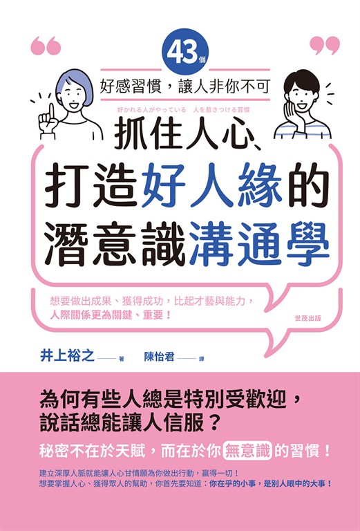 內容簡介 ★日本知名作家井上裕之,傳授累積15年的溝通精髓! ★不須勉強自己,從簡單的43個小習慣開始,啟動潛意識,徹底翻轉人際關係!想要做出成果、獲得成功,比起才藝與能力,人際關係更為關鍵、重要!建立深厚人脈就能讓人心甘情願為你做出行動,贏得一切!想要掌握人心、獲得眾人的幫助,你首先要知道:你在乎的小事,是別人眼中的大事!為何有些人總是特別受歡迎,說話總能讓人信服? ──秘密不在於天賦,而在於你「無意識」的習慣!你是否曾想過,為什麼有些人天生就像自帶光芒,能輕易抓住人心,無論走到哪裡都受人歡迎?他們的成功不只來自於才能或努力,更來自於一種強大的「吸引力」。這種吸引力並非天生,而是來自於待人接物時的43個微小習慣。日本知名牙醫師暨作家井上裕之,憑藉多年與病患的交流,以及對潛意識的深入研究,發現那些能夠長期建立信任、獲得支持的人,都有一套共通的行為模式。這本書將帶你揭開這套黃金法則──43個簡單卻高效的微習慣──,從五大層面教你如何透過簡單的行動,啟動潛意識的溝通力。這五大面向分別是:1. 讓人安心的習慣:消除距離感,建立無條件被接受的基礎,讓他人信任你,不被拒絕或疏遠。2. 讓人信賴的習慣:透過誠信的行動與話語,提升你的說服力與影響力,讓人願意傾聽你、相信你。3. 創造自我價值的習慣:成為有魅力、有價值、無法被忽視的存在,吸引更多人想與你建立關係。4. 給予的習慣:樂於付出,啟動人際關係的「回報機制」,匯聚人脈、工作與財富,收穫更多資源。5. 讓對方感受到自身存在價值的習慣:成為對方的「絕對友軍」,建立難以被取代的緊密羈絆。當你掌握這些習慣並持續練習,你將不再需要費力討好,就能讓他人對你產生**「如果是這個人,我可以相信」**的強烈好感與信賴,而且你會發現,周圍的人會願意為你提供幫助、分享資源,甚至將你視為不可或缺的存在!最終,你的人生能如你所願,不管是人脈、工作、金錢、資訊都能輕易獲取,他人也會為了你而動起來!無論你是社會新鮮人,還是想要提升人際關係的老手,這些簡單的習慣都能幫助你在人際交往中脫穎而出,打造出讓人「非你不可」的好人緣。從現在開始,學會這些小習慣,讓你的生活不再平凡,成為人際交往的高手、最有魅力的存在,擁有想要的一切、將人生掌握在自己手裡!
