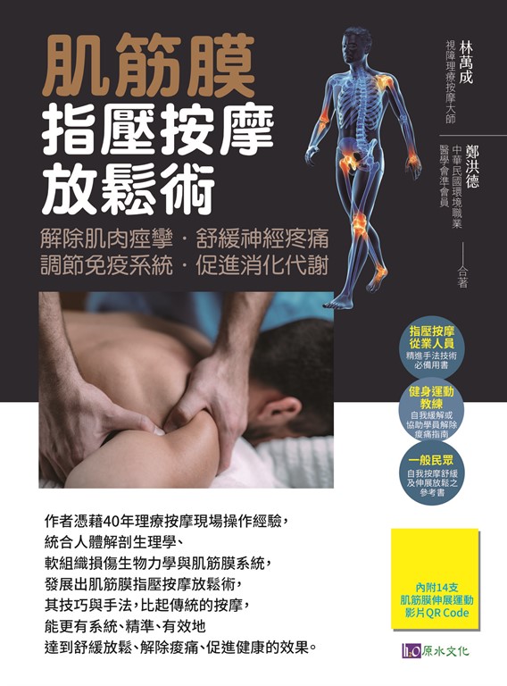 作者介紹 姓名:林萬成● 現任:力行理療按摩負責人● 曾任:中華視障經穴按摩推廣協會創辦人、台北市盲人福利協進會常務理事、按摩業職業工會理事、多家按摩工會、協會及愛盲學院講師● 榮譽:獲 李登輝總統頒發 第一屆殘障楷模金鷹獎(56歲)1940年生,現年85歲。27歲因視網膜變性導致視力明顯減退,34歲全盲,39歲開始學習按摩技術,43歲受教浪越指壓,52歲創新經穴指壓手法,並取得政府理療按摩資格許可證。研究並應用肌筋膜指壓按摩放鬆術逾30年功力,運用身體力學借力使力,即使曾一個月內服務200多位人次也沒有「鐵手」或職業傷害的困擾,迄今已幫助超過近7萬人鬆筋止痛、改善健康!為了推廣指壓按摩之效,不藏私親自示範常見手法,且鑑於按摩施術者多數因工作而有身體勞損現象,更與鄭洪德先生共同研究開發「肌筋膜力學伸展法」,無論是按摩同業或一般人,都可藉此套居家伸展運動遠離痠痛,獲得健康。姓名:鄭洪德輔大英文系畢業。曾任職於台北國賓大飯店,10餘年日夜輪班、服務至上的高壓工作導致身心靈不堪負荷,引發全身肌肉僵硬、肩頸頑固劇痛,求助按摩高手林萬成調理身體,透過數次理療按摩並教導居家伸展動作,不僅恢復健康,也啟發對人體奧妙結構興趣,並開始大量閱讀按摩與伸展醫學人體健康相關書籍。之後離開飯店工作,選修台大醫學院物理治療系肌動學、物理治療理論、動作控制及老人疼痛學;又於北醫選讀營養學、自由基細胞學抗癌及減重學、南京中醫藥大學解剖學,並成為中華民國職業專科醫學會準會員。爾後與林萬成結為莫逆,亦師亦友,共同鑽研有關肌筋膜力學、伸展操與各種手法,歷經20年博採古今中外無數有關人體解剖、生理、放鬆術及細胞生化分子矯正等研究及著作,分享於此書,藉此協助民眾促成身體動態平衡與身體細胞自我修復功能,有益於改善疼痛、保健養生!