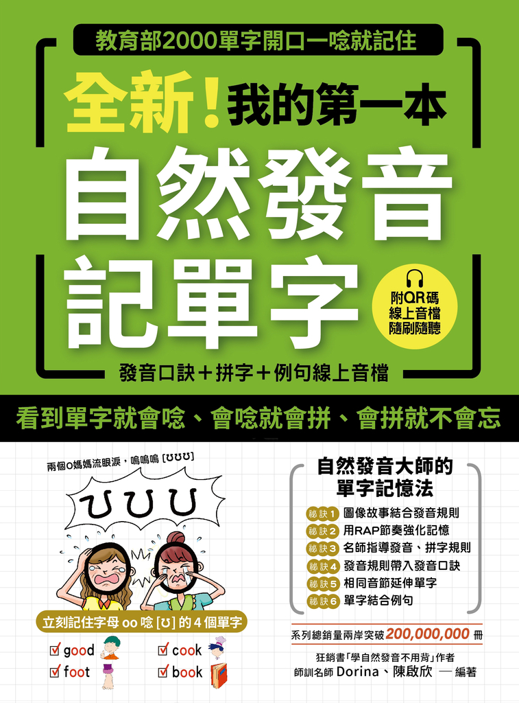 內容簡介 最好記的單字書改版更新,修改例句更符合生活應用,含例句全書音檔化!單字老是記不住、不會拼?用「音律循環」讓大腦無壓力輕鬆學會發音規則、「自然」記住單字,還從此忘不掉!!「記憶口訣」×「Rap音韻」×「情境圖像」×「故事聯想」發音結合拼字,掌握自然發音規則,聽著聽著就學會,唸著唸著就記住!以後看到單字就會唸、唸完就會拼、拼過就不會忘,瞬間將單字的「發音、拼字、字義」一次掌握!上小一前學會記單字的方法,上國中前記住教育部 2000 單字!拿來自學、教學生、親子共讀、還是育兒、胎教皆適用!最新QR碼設計,只要手機一掃,任何地方都能學!「A、A、A,æ、æ、æ;B、B、B,b、b、b」以往自然發音的口訣只注重個別字母與其對應的發音,卻不細說字母的拼字與發音的連結,這樣記單字真的學得會嗎? 「子音+ a +子音,a唸 [æ]」這種難記的規則,要如何快速秒記,還能在6分鐘內記住16個單字呢?孩子即將上國中,看到單字不會唸、會拼的單字沒幾個,該如何在上國中前,打好「看到單字就會唸」、「熟記單字不會忘」的基礎呢?要解決以上問題,答案就是:符合科學!用對方法!選對教材!選對老師!用聽的記單字!本書的優勢就是結合以上特點,讓「自然發音」變成「纏繞著大腦的旋律」,並利用「自然發音」可對應拼字的特性,把單字記下來,像「美國小孩學母語」一樣,聽了就會說,能唸就能拼!◆符合科學:學英文就像「洗腦神曲在腦中循環」一樣,旋律一來馬上會哼、秒記不會忘為何我們常常一看到廣告、一聽到某句台詞或歌曲,就會自然哼起它的旋律,想忘也忘不掉,總是在腦海中不斷出現呢?根據辛辛那提大學行銷學教授James Kellaris提出的認知搔癢(cognitive itch)理論所言,反覆的旋律、編曲簡單的音樂(尤其像是兒歌)容易造成這種所謂「腦內歌曲循環」現象。 就像「被蚊子叮了一口,被叮的地方會癢,讓你忍不住去抓」的道理一樣,洗腦神曲如「被蚊子叮了一口」,當旋律開始在腦海中不斷迴盪就如「被叮的地方一直在發癢」,本書作者Dorina老師以活潑的口訣,搭配輕快動感的節奏,將發音與字母、字母與單字融合在一起,變成一首又一首如洗腦神曲般旋律一來馬上會哼的Rap記憶口訣。例如「A小妹沒禮貌,說起話來æ æ æ」或者「A小妹,說笑話,空氣好冷ㄟ、ɛ ɛ ɛ」,馬上記住字母在某些拼字組合之下的唸法。尤其字母 a 在不同的拼字位置時又會有不同的特定發音規則,若單靠「子音+ a +子音,a 唸成 [æ]」這種教條式的規則,很快就會忘記其發音。 ◆用對方法:用美國小孩的方法學英文,熟記單字好輕鬆要同時學會「看到單字就會唸」、「聽到單字就會拼」、「熟記單字不會忘」,用這本書就對了!書中教你用美國小孩學英文的方法來記單字,也就是以「自然發音」為基礎,透過與字母相關的角色設定(如A小妹),搭配著有故事性的輕快口訣(如「A小妹沒禮貌,說起話來æ æ æ」),將字母與發音串連起來,在重複的節奏之下,更容易在腦海中產生有關聯性的記憶。接著再從字母發音延伸到單字,把相同發音規則組合的好幾個單字整理在一起(如bad、cat、pass等「子音+ a +子音」的單字),繼續在輕快節奏的律動之下,同時記住「發音規則」、「單字拼法」和「單字意思」。就像美國小孩一樣,不需要辛苦死背大量單字,但卻能自然而然地講英文,輕鬆融會貫通英文「形、音、義」的規則。◆選對教材:最適合作為「上小學前」的英語教材配合108課綱與雙語政策,小學階段便開始學英文,許多幼兒園也開始教授英文,這也就表示孩子在唸國小一年級之前,每位孩童都被期望會講英文,才不會到了國小之後跟不上進度。然而政策上路其實沒有幾年,課程規劃及第一線的教學都還在磨合期,此外老師要管班上進度,無法顧及個別的程度差異,關於自然發音這個重要的基礎,老師通常幾堂課就帶過,而草草進入單字、會話單元,若完全仰賴學校的課程,到最後可能真的會跟不上班上的進度。為解決這樣的狀況,不如及早在上小國一年級之前,就先讓孩子學好自然發音,打好英文的基礎,對於發音規則、拼字能力、記單字的能力一開始就有概念,屆時上課時也會比別人更快進入狀況。別的小孩還在一個字母、一個字母「b, a, d, m…」邊想邊拼「羽毛球」的英文,你的孩子已經會拆音節「bad + min + ton」來記單字了。快用本書精心獨創的「記憶口訣」、「Rap音韻」、「情境圖像」、「故事聯想」用最輕鬆、最自然的方法打好英文的基礎吧!◆選對老師:跟著自然發音大師Dorina學自然發音不用背學習英文,一開始最重要的就是引發孩子們的興趣,當孩子們有興趣時就會自己主動去學,不需要爸媽費力地逼迫他們學習。再來一定要學得正確,若是讓小朋友學到不正確的自然發音,定型之後要糾正就很辛苦。Dorina老師是台灣自然發音老師中的老師,教學方式不但能吸引小孩的目光,讓小朋友對英文產生高度興趣,發音的專業度也備受肯定,讓小朋友在興趣培養與正確學習兩方面都能達到完美的平衡。◆顛覆傳統:「記憶口訣」×「rap音韻」×「情境圖像」×「故事聯想」的學習法本書顛覆以往發音教學的制式傳統,精心獨創4大學習祕技:「記憶口訣」、「Rap音韻」、「情境圖像」、「故事聯想」,再搭配「螺旋式學習法」,在記住簡單的單字與發音規則後,再利用此單字與相同的規則記住更加複雜的單字,