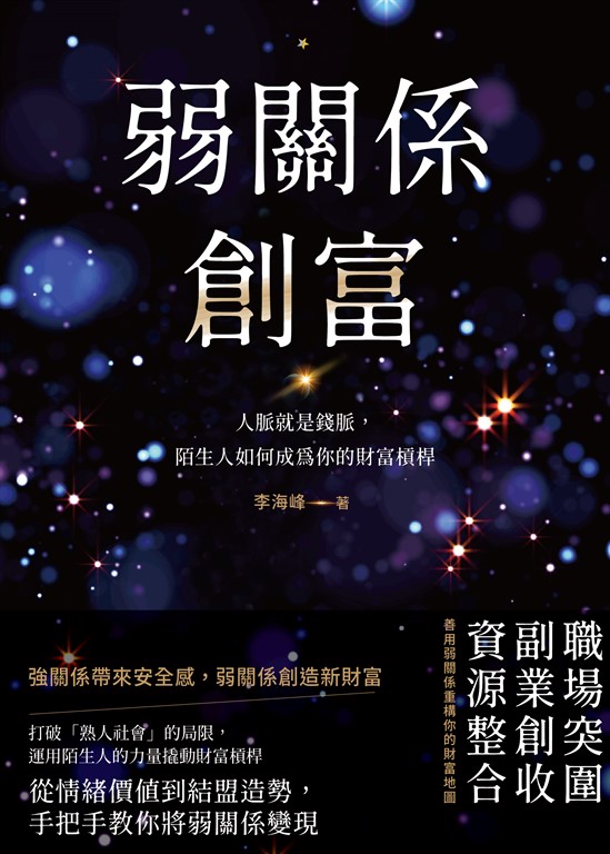 內容簡介 強關係帶來安全感,弱關係創造新財富打破「熟人社會」的局限,運用陌生人的力量撬動財富槓桿★從情緒價值到結盟造勢,手把手教你將弱關係變現★1970年代,史丹佛大學社會學家馬克・格蘭諾維特(Mark Granovetter)著名的「弱連結理論」影響深遠,成為社會科學領域最常被引用的經典文獻之一。半世紀後的今天,由於全球網際網路和社群的蓬勃發展,弱關係的力量甚至更加強大,你認識的人經常為你創造更多的機遇和資源。本書作者李海峰為大型影響力社群DISC社群聯合創始人,連續六年(2020-2025年)蟬聯當當影響力作家,橫跨心理學、職場導師、財經、勵志、人文社科等領域。他透過本書提醒我們,人際關係的背後其實是資訊,利益的獲取就在於掌握資訊差,在這些層層疊疊的關係網絡中,有些不起眼的弱關係,很可能就是你創富的關鍵所在。想要獲得更多的財富,首先要打破圈子,拓展你的人際關係地圖。90%的財富機會藏在「點頭之交」裡,本書分享了37篇關係心法,幫助你撬動隱形人脈紅利,學會做好溝通、維護關係、識別需求、互換價值、打造聯盟、合作共贏,讓弱關係重構你的財富地圖,實現人生指數級躍遷!看完本書:ü 掌握DISC理論,深入剖析人的內心需求。照顧好自己並提供情緒價值,贏得信任,創造出更多貴人ü 明確認知自我、不再迷茫,修練自己的心態,擺脫情緒內耗,習得個體成事的關鍵能力與技巧ü 瞭解五大基本準則,提升人際連結力。養成溝通的三個好習慣,妥善處理工作中的弱關係,建立相互滋養的家庭關係ü 正確認識價值與財富的關係,洞悉個性特點、快速識別需求。吸引他人主動前來合作,做自己的貴人,成為彼此的貴人ü 勢能的大小決定了財富的多少,學會蓄勢,做好借勢與造勢,打造個人IP和個人品牌,駕馭並擴大關係槓桿ü 打造聯盟,增加勢能,積累財富。用產品增加連結的可能性,提升聯盟價值,把握市場大趨勢你的好友列表,是一座尚未開採的金礦。成年人更好的關係:相互滋養,互為貴人,讓每一次的相逢都可能成為命運的轉折點。