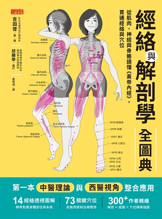 產品目錄 Introduction導讀 中醫醫學的基礎01:陰陽論──無法獨自運行 02:氣──支持恆定性的力量 03:血──生命之水 .04:津液──流動的水不會腐壞 05:臟腑──體內的陰陽 06:經絡──氣血循環的通道 07:經筋──鑿刻在肌肉上的動作 08:個人淺見──針灸專攻的是什麼? Chapter 01 肺01:肺──自律神經的操控者 02:手太陰肺經(Lung meridian) LU01 中府 LU07 列缺 LU09 太淵 03:手太陰經筋 Chapter 02 大腸01:大腸──頭部與腹部的對話1 02:手陽明大腸經(Large intestine meridian) LI04 合谷 LI11 曲池 LI20 迎香 03:手陽明經筋 Chapter 03 胃01:胃──五臟六腑之海 02:足陽明胃經(Stomach meridian) ST04 地倉 ST08 頭維 ST12 缺盆 ST25 天樞 ST30 氣衝 ST34 梁丘 ST36 足三里 ST40 豐隆 ST44 內庭 03:足陽明經筋 ST07 下關 Chapter 04 脾01:脾──虛實一體的臟腑 02:足太陰脾經(Spleen meridian) SP04 公孫 SP06 三陰交 SP09 陰陵泉 03:足太陰經筋 SP21 大包 Chapter 05 心01:心──心位於何處? 02:手少陰心經(Heart meridian)HT05 通里 HT07 神門 03:手少陰經筋 Chapter 06 小腸01:小腸──頭部與腹部的對話2 02:手太陽小腸經(Small intestine meridian) SI03 後溪 SI06 養老 SI09 肩貞 SI11 天宗 SI16 天窗 03:手太陽經筋 Chapter 07 膀胱01:膀胱──成長的路徑 02:足太陽膀胱經(Bladder meridian) BL01 睛明 BL02 攢竹 BL10 天柱 BL12 風門 BL13 ∼ 28 背俞穴 BL13 肺俞 BL15 心俞 BL18 肝俞 BL20 脾俞 BL23 腎俞 BL43 膏肓 BL51 肓門 BL53 胞肓 BL40 委中 BL58 飛揚 BL60 崑崙 BL62 申脈 BL67 至陰 03:足太陽經筋 Chapter 08 腎01:腎──生命之根、生身之本 02:足少陰腎經(Kidney meridian)KI01 湧泉 KI06 照海 KI16 肓俞 03:足少陰經筋 Chapter 09 心包01:心包──孕育喜悅的臟器 02:手厥陰心包經(Pericardium meridian) PC06 內關 PC08 勞宮 03:手厥陰經筋(手心主之筋) Chapter 10 三焦01:三焦──位在邊界的謎團 02:手少陽三焦經(Triple Energizer meridian) TE03 中渚 TE05 外關 TE15 天髎 TE17 翳風 TE21 耳門 03:手少陽經筋 Chapter 11 膽01:膽──中正之火 02:足少陽膽經(Gallbladder meridian) GB03 上關 GB12 完骨 GB20 風池 GB26 帶脈 GB29 居髎 GB30 環跳 GB34 陽陵泉 GB39 懸鐘 GB41 足臨泣 03:足少陽經筋 Chapter 12 肝01:肝──軍師的後勤 02:足厥陰肝經(Liver meridian) LR03 太衝 LR08 曲泉 LR09 陰包 03:足厥陰經筋 Chapter 13 奇經八脈01:奇經八脈──經絡的發育生物學 02:任脈(Conception Vessel) CV04 關元 CV12 中脘 CV17 膻中 03:督脈(Governor Vessel) GV09 至陽 GV14 大椎 GV20 百會 參考文獻 東方醫學類索引 西方醫學類索引