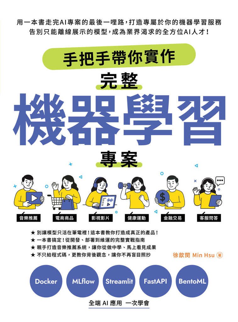 內容簡介 https: youtu.be t-9Yehef1Lk用一本書走完AI專案的最後一哩路,打造專屬於你的機器學習服務告別只能離線展示的模型,成為業界渴求的全方位AI人才!★ 別讓模型只活在筆電裡!這本書教你打造成真正的產品!★ 一本書搞定!從開發、部署到維運的完整實戰指南。★ 全端AI應用,一次學會Docker、MLflow、Streamlit、FastAPI、BentoML。★ 親手打造音樂推薦系統,讓你從做中學、馬上看見成果。★ 不只給程式碼,更教你背後觀念,讓你不再盲目照抄。【打好地基】搞懂MLOps核心觀念,不再紙上談兵●完整生命週期:從商業需求到監控迭代,一次搞懂 AI 產品的五大核心階段。●關鍵維運挑戰:深入了解資料漂移、模型老化,剖析模型上線後為何會「變笨」。●版本控制核心:不只管程式碼,更要學會管理資料與模型,確保專案的可追溯性。●迭代優化思維:掌握模型與資料導向策略,聰明提升模型表現,告別盲目調參。【動手實戰】跟著做,親手打造全端AI應用●音樂推薦系統:以真實資料為例,整合所有主流工具,讓你從做中學。●高效實驗追蹤:導入DVC和MLflow管理資料、模型與參數,告別混亂的開發過程。●現代化模型部署:採用BentoML將模型打包成產品,實現真正的線上服務。●打造互動式前端:使用Streamlit開發視覺化介面,讓你的AI服務更好用。【整合應用】將模型變為產品,創造真實價值●建構完整架構:整合Docker、資料庫與FastAPI,打造穩定可靠的後端服務。●API整合串接:將你的模型封裝成API,與其他應用程式順暢溝通。●職涯技能升級:填補從「模型開發者」到「AI系統架構師」的關鍵知識缺口。【本書適合】●資料科學家:模型準確率很高,卻不知道如何部署上線,讓它真正發揮價值?●軟體工程師:想踏入最熱門的AI領域,卻不知從何開始建構機器學習系統?●機器學習工程師:厭倦了零散的知識,想尋求一套完整的MLOps實戰方法?●技術主管與PM:需要規劃與評估AI專案,想精準掌握從開發到上線的每個環節?●所有想踏入這個領域的人: 只要你想搞懂AI如何從無到有變成產品,這本書就是你的最佳起點!想了解AI如何從無到有變成產品?別懷疑,這本書就是為你而寫!