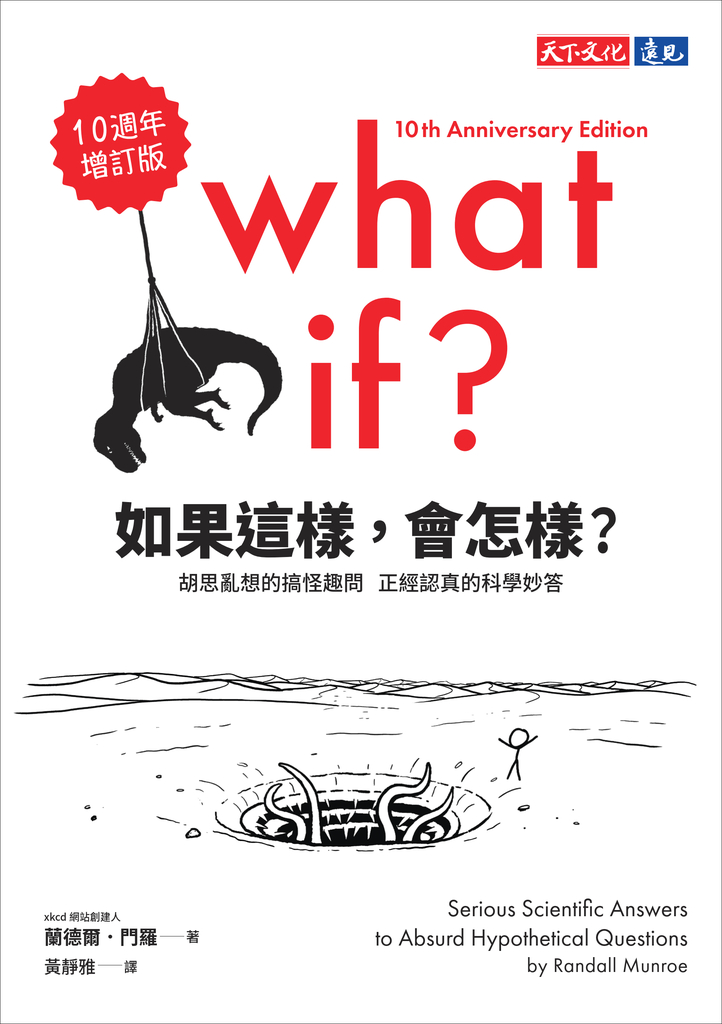 產品目錄 10週年版自序 因為在乎,所以有意義!全球大風暴相對論棒球用過核燃料池「What If ?」收件匣收到的,稀奇古怪(且令人憂心)的問題,#1紐約時光機靈魂伴侶雷射筆照月球元素週期牆大家一起跳1莫耳的鼴鼠金剛不壞吹風機「What If ?」收件匣收到的,稀奇古怪(且令人憂心)的問題,#2最後的人造光機關槍噴射背包等速平穩升空「What If ?」收件匣收到的,稀奇古怪(且令人憂心)的問題,#3太空軌道潛艇簡答題閃電「What If ?」收件匣收到的,稀奇古怪(且令人憂心)的問題,#4人腦與電腦的大戰小王子的小行星天上掉下牛排來冰上曲棍球消滅普通感冒半空的杯子「What If ?」收件匣收到的,稀奇古怪(且令人憂心)的問題,#5外星天文學家DNA 突然消失星際西斯納飛機「What If ?」收件匣收到的,稀奇古怪(且令人憂心)的問題,#6尤達大師飛越之州帶著氦氣球跳機出地球記「What If ?」收件匣收到的,稀奇古怪(且令人憂心)的問題,#7自體受精可以扔多高致命微中子「What If ?」收件匣收到的,稀奇古怪(且令人憂心)的問題,#8要命減速坡迷途的永生者軌道速率聯邦快遞的頻寬自由落體「What If ?」收件匣收到的,稀奇古怪(且令人憂心)的問題,#9萬箭齊發遮天蔽日海洋排光光海洋排光光,Part II推特樂高大橋最長的日落隨機祝福電話「What If ?」收件匣收到的,稀奇古怪(且令人憂心)的問題,#10不斷擴張的地球無重力的箭沒有太陽的地球更新紙本的維基百科臉書用戶生死論日不落國的日落攪熱茶世界上所有的閃電宇宙間最孤獨的人「What If ?」收件匣收到的,稀奇古怪(且令人憂心)的問題,#11超級大雨滴SAT 猜猜猜中子槍彈「What If ?」收件匣收到的,稀奇古怪(且令人憂心)的問題,#12芮氏規模15加贈一章致謝參考資料