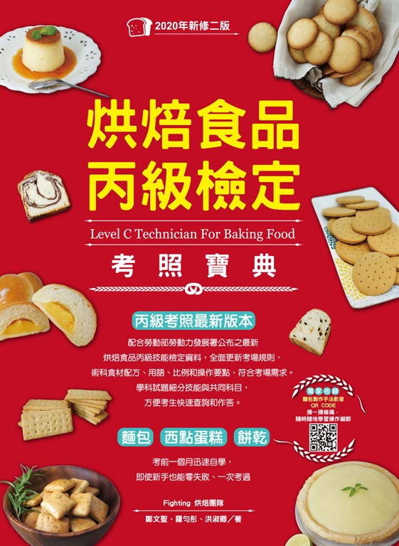 內容簡介 ★丙級考照最新版本★配合勞動部勞動力發展署公布之最新烘焙食品丙級技能檢定資料,全面更新考場規則,術科食材配方、用語、比例和操作要點,符合考場需求。學科試題細分技能與共同科目,並結合作者豐富的教學經驗,提供難題精解,方便考生快速讀懂考題精髓,一次選對。麵包、西點蛋糕、餅乾考前一個月迅速自學,即使新手也能零失敗、一次考過,輕鬆搞定麵糰和餡料、詳盡圖解作法,快速掌握考證技巧考生必看‧創業者必讀‧愛好者必學、必吃◆應考須知:應檢身分、著裝、評分表、配方表、時間分配表一應俱全◆基礎實務:常用材料特性和配方比、器具型號和尺寸, 打穩基礎好過關◆詳細食譜:包含材料配方比、計算公式、成品數量和獨家操作祕訣,讓你一次就成功◆圖文並茂:圖解操作步驟,圖文對照,彷彿名師在身邊◆最新題庫:收錄最新檢定題庫和解析,省去上網找題時間,一本滿足所有應考需求獨家收錄麵包製作手法影音QR CODE掃一掃條碼,隨時隨地學習操作細節想知道全國技術士技能檢定的最新、最即時考場資訊?看這本就夠了!最新考規,術科比例、配方、材料調整,最新學科難題解析★獨家提供★ 編寫老師皆擁有多張食品類證照,常年轉戰各大考場,深知烘焙實務和考場潛規則,獨家提供考試祕訣,讓讀者能夠在最有自信的條件下完成考場操作,一次就考過!考試過關、開店創業、居家自學,All In One為協助讀者能輕鬆取得烘焙丙級證照,將產品的製作方法、關鍵性技巧點及應注意事項,利用多張的步驟分解圖、成品圖及詳細的製作說明,用淺顯易懂的方式呈現,使讀者能快速領略製作技術上的奧妙,讓讀者依操作步驟說明,快速領略製作技巧,進而收到事半功倍之效,輕鬆取得丙級證照。快速考照六大關鍵1. 圖表對照,應考須知好清楚表格化考試要點,搭配圖片解說,一目了然,快速掌握應考原則,正確分配考試時間,臨場不緊張。2. 基礎實務說明詳盡,搭配影音教學無遺漏烘焙基礎知識解說詳盡,方便讀者舉一反三,善用材料特性和選對烘烤模具。並附有操作手法QR CODE,掃描條碼即可立即360度觀察各種技巧,學習無死角,細節無遺漏。3. 食譜全方位,應考、創業、自學自吃皆宜7款土司麵包、7款蛋糕甜點、7款西點餅乾,應考必學食譜全收錄,道道經典又美味,便於取得證照,將來打算創業開店或自行烘焙慰勞家人,通通沒問題。4. 獨家收錄名師小叮嚀,成功祕訣就在這3位作者累積多年的教學和實務操作經驗,分享揉麵、發酵、調整口味、包餡、整型、探知烤箱溫度等獨家祕訣,確實達到操作零失敗,一次就成功!5. 超過300張操作圖片,圖文對照,學習好輕鬆每道食譜皆搭配分解圖照,鉅細靡遺,彷彿名師在身邊,初學者可以一看就懂,快速上手,已有基礎者可以從中精益求精,更上層樓。6. 收錄最新學科題庫,加深記憶和學習效果廣收最新學科題庫,加上解答,方便考生在家自行演練,省下上網搜尋題庫和答案的時間,一本滿足學科、術科的所有應試需求。本書特色★根據最新考試規則編修,提供考證者最完整的資訊。★網羅3位經驗豐富的烘焙老師來親自演練、指導,提供成功率高、穩定性強的配方和做法,跟著做免失敗。★超過300張精美圖照,圖文講解,學習最快速。★提供製作手法影音QR CODE,掃描條碼即可隨時隨地觀看影片和學習。★小叮嚀和表格完善,便於讀者對照和操作時補強。★涵蓋丙級檢定考試必考的西點類和麵包類,臨場應試選材輕鬆。★收錄最新學科題庫,在家自學、自測更省時。
