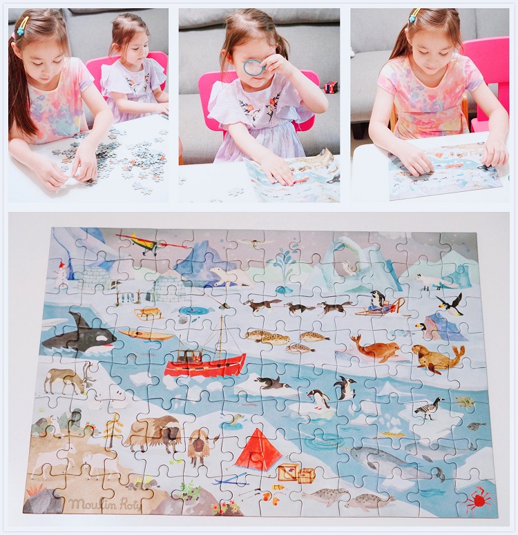 透過手繪水彩的風格,加上一支獨特的放大鏡,孩子拚好拼圖後,一同找找自然界的動物