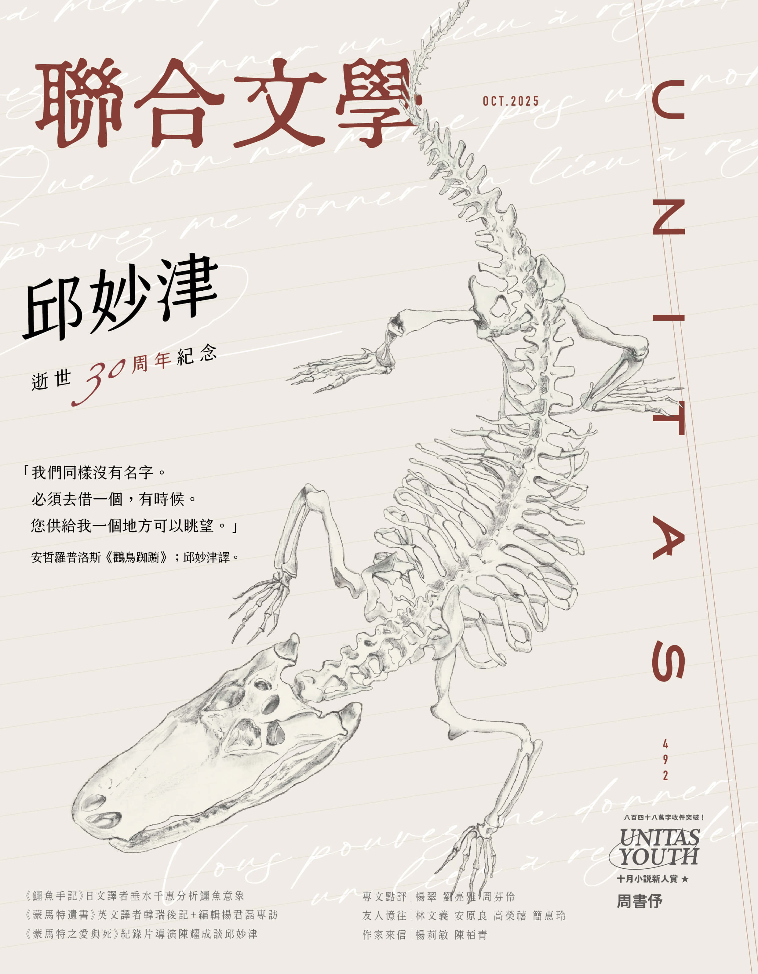 產品目錄 COVERSTORY026 邱妙津逝世三十周年紀念028 專文點評 獻身與穿越――邱妙津書信體/手記體中的複聲多音 楊翠 百分之百的主體性:邱妙津及其名作 劉亮雅 淌血的精神構圖――《寂寞的群眾》與《鬼的狂歡》的後人類讀本 周芬伶036 友人憶往 乾姊問我為什麼要賴床 簡惠玲 社團學姐、桌球校隊,和電影導演 安原良 三十年前編者按 林文義 側記邱妙津一二事 高榮禧038 日本觀點 分身與我,埋葬與羞恥:翻譯者眼中的「鱷魚」意象來源 垂水千惠046 美國觀察 世界文學中的邱妙津:專訪《蒙馬特遺書》英譯本編輯楊君磊 林新惠050 譯者後記 愛的物件:邱妙津生平與書信 韓瑞056 導演憶往 演員兔兔 陳耀成064 作家來信 品嚐十年前的初遇 楊莉敏 愛的建案平面圖 陳栢青SPECIAL特輯 066 礁溪老爺酒店二十周年REGULAR009 目錄011 編輯室報告 王聰威012 巷口新書攤 包子逸╳林佳樺019 問哲學/看歷史/寫流行018 新人新書 紅紅072 當月作家 馬翊航 078 聯文選書082 城市文學直達 長野/倫敦/里斯本/海牙086 當代大師 科爾森・懷特黑德090 編舟計畫092 靈魂交換 曹仕翰 vs. 詹晨智098 十月小說新人賞 UNITAS YOUTH106 作品刊登 李瑄瑄 吳宜霖118 下期預告 《國寶》與吉田修一122 編輯小隊*封面詩句引用自聯合文學出版社於一九九六年五月出版的《蒙馬特遺書》第一百九十五頁。