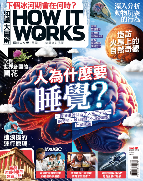 產品目錄 14全球瞭望特別單元22人為什麼要睡覺?一夜好眠是生活中不可或缺的一環,但要獲得足夠的休息卻不容易。本文將一探睡眠背後的科學原理,以及讓人輕鬆入眠的妙招科學新知30學校必備的科學儀器參觀實驗教室,一探校園中科學儀器的運作方式36瞭解黑猩猩的溝通方式從啃咬樹葉到跺腳,一同探究這些靈長類的多種姿勢代表了什麼特殊涵義歷史回顧38世界各國的國花為什麼有些地區或國家會將特定的植物或花卉作為自身的象徵?40建造希臘神廟古代的建築師透過哪些技法,打造出這些世界知名的宗教建築?太空探索42與指南同遊火星穿上太空衣,準備探訪紅色星球的熱門打卡景點46何謂巨引源?前進群星,一探究竟是什麼原因讓「巨引源」如此引人著迷?交通運輸50驚人的自主航行船舶從現代版「五月花號」到會飛的水上計程車,自主航行船舶正載著船員航行得比以往都遠,穿越全球各地的航道環境生態54動物為何玩耍?從玩球的蜜蜂到滑雪的鳥類,動物的娛樂行為是否有其理由?60重新認識恐龍這些曾遍布地球的生物常被描繪成布滿鱗片的巨獸,但近期的發現則令世人有所改觀64下個冰河期會在何時?透過追蹤地球繞行太陽的軌跡,科學家得以預測地球下一次的嚴寒期66什麼是地下水位?深入瞭解地下水,揭開它們究竟從何而來?科技大觀68造浪池的運作方式見識能生成完美人造浪的技術70建造超級摩天大樓直入雲霄的杜拜哈里發塔是目前最高的人造建築,而其背後的設計將成就更高的建築72家電解密人們常將維持家庭運作的各種科技視為理所當然。但家電的運作原理是什麼?74快知識75金頭腦大考驗76問問題 長知識82現代人該知道