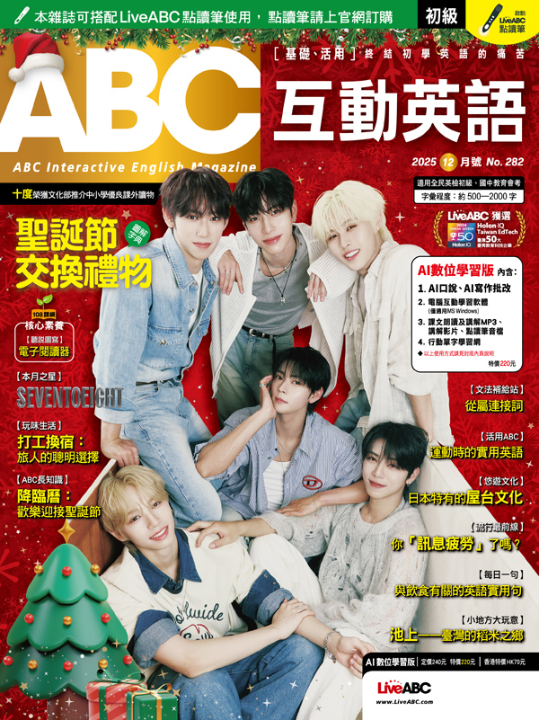 內容簡介 自2025年5月號起,發行『數位學習版』名稱變更為『AI數位學習版』本月焦點:聖誕交換禮物聖誕交換禮物(Christmas Gift Exchange)可以說是本月大家最期待的一項活動。本篇以貼近日常的角度,模擬交換禮物時的趣味對話。從抽籤選出對象、討論喜好,到思考如何在二十美元(約台幣六百四十元)的預算(budget)內買到合適的禮物,都充滿挑戰與期待。當我們迫不及待拆開禮物時,有人得到香氛小物,有人則收到藍牙喇叭(Bluetooth speaker),驚喜與笑聲此起彼落。最後,大家還要猜測誰才是自己的神祕聖誕老人,讓整個過程更添歡樂與溫馨。活用ABC:運動時的實用英語本月我們將帶你走進運動情境,學習如何用英語談論運動、練習與合作。從踢足球(soccer)到排球練習,再到雙打比賽的團隊合作(teamwork),都收錄在內。你會學到實用單字與表達,如「You won’t be tired once you get some fresh air.」(呼吸到新鮮空氣後,你就不會累了。)、「Practice makes perfect.」(熟能生巧。)快翻開本單元,和我們一同體驗運動的樂趣,在輕鬆的對話裡邊玩邊學英語!品格英語:用冷靜打造內心的力量生活中難免會遇到困難,像是弄丟東西、與人爭執或犯錯,都可能使我們焦慮(stress out)、不安。當壓力上身時,心跳加快、情緒激動,甚至頭腦不清晰。此時最重要的就是保持冷靜(stay calm)。停下來深呼吸(take a deep breath),能讓思緒安定並幫助身體放鬆。接著,專注於當下(focus on the present),不要讓情緒牽著走,而是期待好事的發生。冷靜能讓我們思路更清楚,做出更好的選擇。本單元將帶你學會在困境中自我調整,並透過故事與練習,幫助你更從容的生活。世界好望角:讓瀕危語言再次被聽見語言不僅是溝通工具,更是傳承與傳統(tradition)的重要媒介。然而,全球近半數語言正處於瀕危狀態,尤其在熱帶地區,許多原住民族群因生活艱難遷往城市,母語逐漸流失。當語言不再被使用,歷史與智慧也隨之流失。為了保存語言,國際間積極推動計畫,透過科技(technology)與教育錄製影片、設計聊天機器人,甚至用遊戲和故事幫助孩子學習。本單元將帶你了解語言流失的原因與影響,並看見語言的重要性。悠遊文化:日本特有的屋台文化街頭小吃在全球廣受歡迎,而日本的屋台(yatai)則別具特色。傳統屋台是一種有輪子的木製推車(cart),傍晚推上街頭,販售拉麵(ramen)、天婦羅(tempura)和煎餃(gyoza)等料理,營業至深夜。若想一探究竟,福岡是體驗屋台文化的最佳地點,其中中洲和天神最為知名。人們在此不僅能品嚐美食,還能與老闆和顧客互動,感受溫暖的人情味。本單元將帶你深入認識屋台的歷史與魅力,並學習相關英文單字。