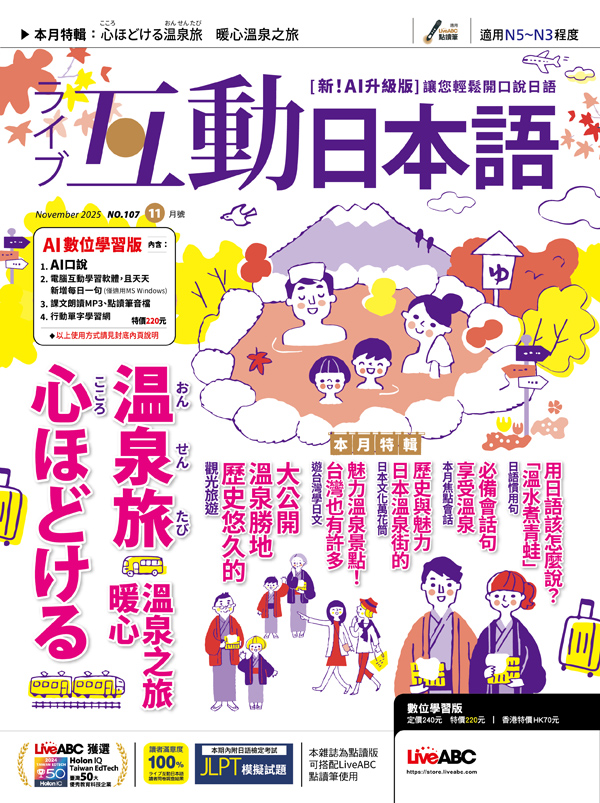 內容簡介 (誠品書店)隨刊贈送《互動日本語年度特刊 訂完機票買這本 用日語暢遊人氣景點》乙本,贈品數量有限送完為止。自2025年5月號起,發行『數位學習版』名稱變更為『AI數位學習版』時序入秋,日漸涼爽的天氣正適合來趟溫泉之旅。本期《ライブ互動日本語》之特輯主題為「暖心溫泉之旅」,與您一同暢遊日本溫泉景點,漫步懷舊溫泉街,品嚐溫泉街經典美食,從身至心,暖暖地度過微涼秋日。 【本月焦點】(P.10)以圖解單字帶您認識溫泉勝地,還有實用會話影片,讓我們一同啟程,穿著美麗浴衣漫步溫泉街。還有特殊的溫泉體驗,請絕對不要錯過! 【觀光旅遊】(P.16)日本有著千年以上之泡溫泉歷史,全國各地更是遍佈著具有悠久歷史的知名溫泉。本次便為您精選六處風情各異的溫泉景點,一起出發來趟療癒身心的溫泉之旅吧。 【日本萬花筒】(P.24)來到溫泉景點,除了享受溫泉療效外,溫泉街也有著豐富娛樂活動等您來探索。除了溫泉街必吃美食,還要為您介紹具代表性的三座溫泉街,讓您的溫泉之旅氣氛十足。 【遊台灣學日語】(P.30)位於板塊交界處的台灣,也是有著百處以上溫泉之溫泉大國,而泡溫泉的習俗也在日治時期傳入台灣,並普及於社會大眾。本次將與您遍巡台灣溫泉,在泡著溫暖泉水的同時,徜徉於台灣溫泉歷史與懷舊氛圍中。本期之學習單元也精采可期! 【美食日語】(P.36)關東煮是秋天常見的美食,那麼您知道經典的日式關東煮有哪些必備食材嗎?而在溫暖的沖繩,也有著不分季節皆可享用到的在地風味關東煮,讓我們一起來認識這些美食吧! 【主題式真人會話】(P.58)在日常閒聊或正式場合中,都可能有詢問他人過去經驗的機會。這時該如何以日語向不同的談話對象發問呢?本次以實用會話影片,帶您一起學習日語中三種常見之詢問有無經驗的說法,讓您輕鬆掌握不同場合中的日語表達。 【JLPT模擬試題N5】(P.66)秋季是收穫的季節,想必在學習方面也是收穫滿滿。別忘了用JLPT模擬試題為自己打個分數,承先啟後,迎向下一個階段的學習!祝您有個秋高氣爽,努力不懈的十一月!《ライブ互動日本語》編輯部