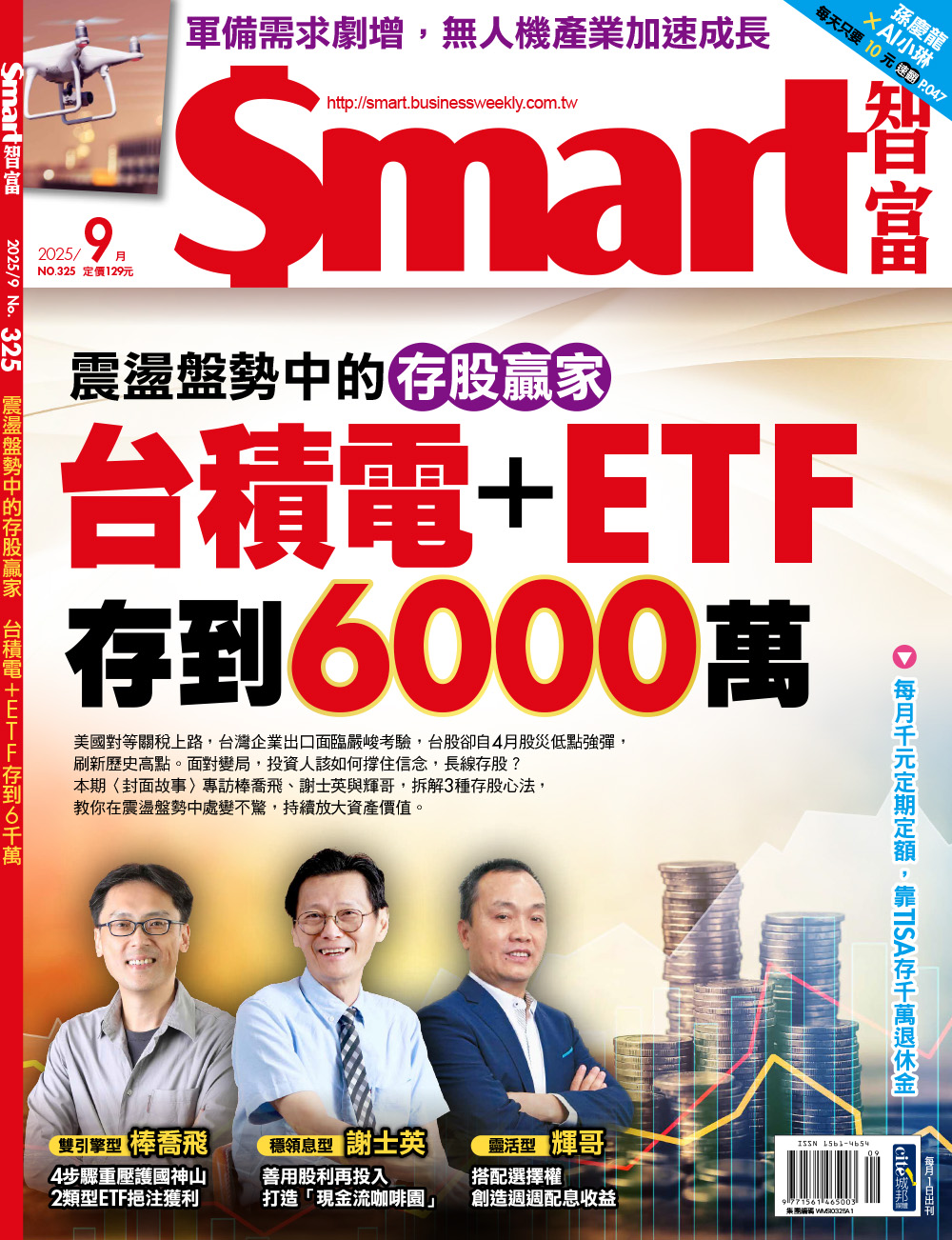產品目錄 Cover(第一跨)066 震盪盤勢中的存股贏家台積電+ETF存到6000萬070 雙引擎型》單靠股息難以滿足資產長期增長需求4步驟重壓護國神山 2類型ETF挹注獲利076 穩領息型》只進不出,持續累積部位善用股利再投入 打造「現金流咖啡園」082 靈活型》以長抱成長股作為主軸搭配選擇權 創造週週配息收益Focus(第一跨右下)〈全球財經眼/李民宣〉020 AI火熱、傳產衰退,讓台股呈「一國兩市」降息利多、關稅利空9月將正面對決!Stock〈股市焦點〉088 因應兩岸地緣政治風險升溫軍備需求劇增 無人機商機起飛Column〈總編輯的話〉010 台股創新高與未來風險〈投資筆記〉012 投資地獄?〈基金列車/蕭碧燕〉014 全球經濟未明 基金該怎麼配置?〈讀者頻道/夏韻芬〉016 主動式ETF該怎麼挑?Focus〈總經新視界/游庭皓〉022 通膨走勢添變數 聯準會決策陷兩難Money〈退休天地〉026 每月千元定期定額 靠TISA存千萬退休金〈保險天地〉030 用年金險分散長壽經濟風險〈樂活退休/王儷玲〉032 長照3.0的關鍵解方〈理財保健室/廖一聰〉034 3大關鍵規畫 轉嫁老後風險〈樂退投資學/99啪〉036 股票質押vs.槓桿ETF〈總經真觀點/張真卿〉038 AI將讓美國再次偉大House〈房市速遞〉040 台北、新北捷運站周邊實價行情042 桃園、新竹、台中、台南、高雄熱門行政區實價行情Fund〈基金趨勢〉044 關稅風暴趨緩 適時重新盤點投資配置〈基金教戰〉048 美印關係陷冰點 印度股市能否振衰起敝?〈ETF新兵〉052 債券ETF:00982B、00984B〈基金瞭望〉054 加密貨幣、黃金ETF熱度升溫〈基金布告欄〉056 4433法則精選》7月優質基金058 海外基金排行062 國內基金排行Stock〈存股追蹤隊〉092 營運大追蹤:富邦金、致伸〈葉芳看台股/葉 芳〉094 輝達推動電力革命受惠台廠出列〈財報診療室/股 魚〉096 蘋果摺疊機成新轉機──新日興〈隊長看產業/張 捷〉098 AI產業進入新世代〈股市教戰/廖繼弘〉100 台股多頭續航!〈美股最前線/林子揚〉102 AI助攻軟體業營收成長〈籌碼研究所/權證小哥〉104 掌握大戶動向 看懂多空變化〈趨勢導航/楊忠憲〉106 趨勢為王 勿盲目追高Serve〈搶先書摘〉108 投資未來醫療的免疫細胞儲存111 基金優惠