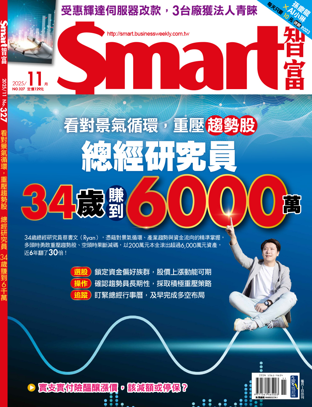 產品目錄 Cover(第一跨) 68 看對景氣循環,重壓趨勢股總經研究員34歲賺到6000萬76 選股》從3方向尋找趨勢股鎖定資金偏好族群 股價上漲動能可期80 操作》單一持股最高可達整體資金30%確認趨勢具長期性 採取積極重壓策略84 追蹤》掌握每個可能影響市場的時間點盯緊總經行事曆 及早完成多空布局Focus(第一跨右下) 〈全球財經眼/李民宣〉18 稀土議題為全球局勢再添亂美、中衝突升溫 AI成角力主戰場Stock(第3頁) 〈股市焦點〉86 OpenAI點火!AI供應鏈想像空間大受惠輝達伺服器改款 3台廠獲法人青睞Column 〈總編輯的話〉10 AI生產力革命〈投資筆記〉12 人人加槓桿〈基金列車/蕭碧燕〉14 該選單筆投入還是定時定額?〈讀者頻道/夏韻芬〉16 金價狂飆頻創高 該趁勢出清嗎?Focus 〈總經新視界/游庭皓〉20 川普放鬆監管之路 恐吹響危機前奏Money 〈保險天地〉22 實支實付險醞釀漲價 該減額或停保嗎?〈樂活退休/王儷玲〉26 FIA躍升退休保險新選擇〈理財保健室/楊馥瑄〉28 讓資產傳承成為愛的延續〈樂退投資學/99啪〉30 2指標看股市是否過熱〈總經真觀點/張真卿〉32 樂觀看待台股年底行情House 〈房市速遞〉34 台北、新北捷運站周邊實價行情36 桃園、新竹、台中、台南、高雄熱門行政區實價行情38 全台與七都即時房價指數分析Fund 〈基金趨勢〉40 5原因讓資金轉向 黃金躋身避險新寵〈基金投資〉44 投資人需加買主動式ETF嗎?〈基金投資〉48 用2類基金 錢進加密貨幣市場〈ETF新兵〉52 被動式ETF:00981T、009813〈基金瞭望/曾淑雲〉56 淺談私募股權投資〈基金布告欄〉58 4433法則精選》9月優質基金60 海外基金排行64 國內基金排行Stock 〈存股追蹤隊〉90 營運大追蹤:欣銓、鈺齊-KY〈葉芳看台股/葉 芳〉92 AI大漲價時代來臨〈財報診療室/股 魚〉94 電能解決方案供應商─光寶科〈隊長看產業/張 捷〉96 記憶體產業進入超級循環週期〈股市教戰/廖繼弘〉98 台積電領軍 大盤多頭續航〈美股最前線/林子揚〉100 股票代幣化正在顛覆全球市場〈籌碼研究所/權證小哥〉102 追蹤法人籌碼與關鍵分點的訣竅〈趨勢導航/楊忠憲〉104 台股高檔震盪 防守中求穩Serve 〈搶鮮書摘〉106 洞悉改變世界經濟的5大力量110 基金優惠