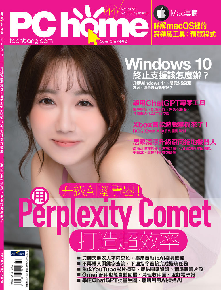 內容簡介 【特別企畫】升級AI瀏覽器!用Perplexity Comet打造超效率與聊天機器人不同思維,學用自動化 AI 搜尋體驗不再輸入關鍵字查詢,下達指令直接完成繁瑣任務生成YouTube影片摘要、提供關鍵資訊、精準跳轉片段Gmail郵件也能自動回覆、清理收件匣、退訂電子報串連ChatGPT批量生圖,聰明利用AI操控AI【特別企畫】Windows 10終止支援該怎麼辦?升級 Windows 11、購買安全延續方案、還是換新機更好【特別企畫】學用ChatGPT專案工具集中對話、記憶內容、客製化指令,打造個人化AI工作空間【特別企畫】黑色攝影的永恆魅力重新發現單色世界的美好【新玩意】Xbox首款遊戲掌機來了!ROG Xbox Ally系列重點評測【採購趨勢】居家清潔升級滾筒拖地機器人滾筒活洗技術不再越拖越髒 、AI識別與避障功能更精準、基座加熱有效清潔【Mac專欄】詳解macOS 裡的跨領域工具:預覽程式