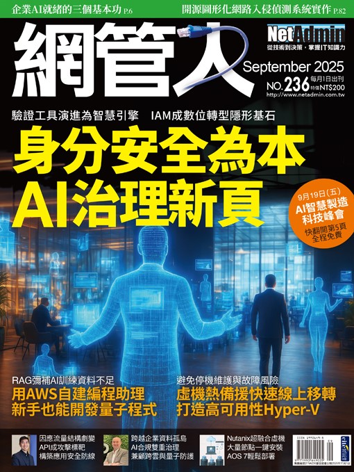 內容簡介 網管人236期(2025年9月號)【封面故事】驗證工具演進為智慧引擎 IAM成數位轉型隱形基石身分安全為本 AI治理新頁因應AI代理與機器帳號激增 存取控管朝向智慧化邁進以身分為核心治理 AI助攻驅動IAM進化機器身分暴增與代理型AI崛起 平台化策略控管成關鍵特權存取走向AI代理 身分為本強化資安治理Unified架構因應零信任與合規壓力 演算模型輔助盤點追蹤身分治理進化為生態核心 AI助企業掌控數位風險本土自主研發與整合策略 以身分為核心落實零信任架構驗證技術持續擴展平台化 IAM轉型落實資安治理【深度學習】無共用架構也能即時切換節點 避免停機維護與故障風險虛機熱備援快速線上移轉 打造高可用性Hyper-V【技術論壇】Foundation VM全程圖形化操作 IP位址批次鍵入省時省力超融合大量節點一鍵安裝 Nutanix AOS 7輕鬆部署RAG彌補新興語言訓練資料不足 生成除錯提交一次到位用AWS自建AI編程助理 新手也能寫量子運算程式MetaSleuth掌握鏈上資金流向 追溯詐騙勒索攻擊者身分遏止虛擬幣洗錢資安犯罪 區塊鏈金流分析有利器開源Suricata搭配Evebox 網路入侵偵測系統兼顧彈性即時部署NIDS補防火牆不足 圖形可視化辨識惡意封包【名家專欄】企業AI就緒的三個基本功量子韌性與AI資安轉型四大AI資料管理訣竅【市場新知】應用安全進化 築起AI時代防線流量結構劇變 API成攻擊標靶【產業趨勢】Data Fabric與量子防護並進 強化資料韌性與可控性跨越金融企業資料孤島 實現AI與合規雙重治理高授權費與平台綁定問題浮現 多雲混合變身部署主流從平台移轉至AI整合 虛擬化成IT創新轉型動能ASRC揭露第二季觀察報告 偵測規則應下到個人層級電郵攻擊大量走合法平台 新漏洞才出就被武器化台灣首次電簽採用大調查 供應鏈及政府溝通運用多電子簽章獲大企業青睞 期成金融業數位轉型契機先評估攻擊風險及財務影響 四大安全措施趨吉避凶效率創新恐成資安災難 企業導入LLM勿輕忽防護【深度觀點】效能佳閉源模型受青睞 Claude帶動編程首登殺手應用流程Agent化 工具專用化 企業AI市場火熱拚變現從訓練資料到模型控管 提升可視性與自動化應對威脅九成決策者憂攻擊面擴大 導入AI先做好風險管理