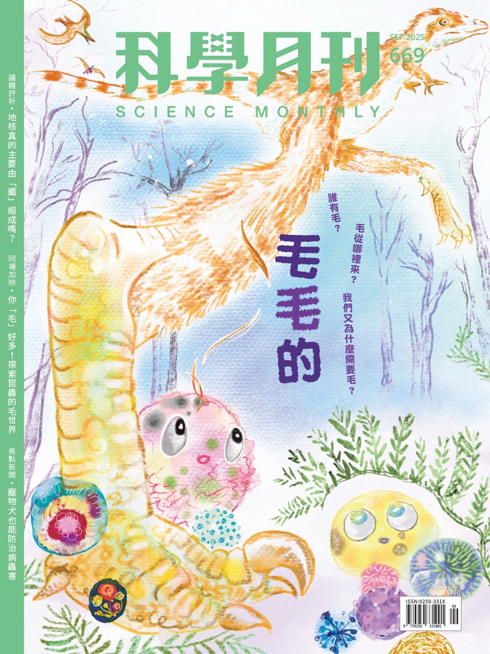 內容簡介 「毛」的大亂鬥你多久剪一次頭髮?家裡有養貓或狗嗎?或者,睡覺時一定要抱著絨毛娃娃才安心入睡?生活中,我們無處不與「毛」相遇——頭上的毛髮、寵物身上的皮毛、衣物上的絨毛等,早已融入我們的日常。在文字中,「毛」也有豐富的涵義。它可以指人的鬚髮、動植物表面的絲狀物;可以用「毛躁」來形容一個人心浮氣躁;也可以用「毛骨悚然」,來描繪一個人從外在毛髮到骨頭深處都染上寒意的恐懼。甚至在現代人日常口語中,也會用「毛很多」來形容一個人問題特別多、很麻煩。我們的生活離不開「毛」,但你可曾真正認識過它?你是否想過:誰的身上有毛?毛是從哪裡來的?我們又為什麼需要它?毛髮究竟有什麼功能?這些看似簡單的問題,其實一點都不簡單。所以在本期封面故事中,我們將帶你追溯哺乳類毛髮的起源,探索連細菌也擁有的神奇毛構造;走進古生物化石,揭開恐龍羽毛的發現歷程;解讀狗毛背後隱藏的人類足跡與社會文化;最後,探討為什麼人類會從毛茸茸的祖先,變成如今只留下零星毛髮的模樣。另外,在本期的生物專欄,我們還同場加映「昆蟲毛」,讓你一次看盡各種毛的特化與功能,來場跨物種、跨時空「毛」的大亂鬥。現在,就跟著封面的毛團,一起踏上跨越億萬年的毛毛之旅吧。副總編輯 李依庭封面說說話本期封面以插畫結合特殊觸感紙材,打造不同以往的閱讀體驗,帶領讀者踏入「毛的世界」。從一隻微小生物貼近地面、仰望巨大生物身上一小撮毛的微觀視角,到碩大的中華龍鳥與顯微鏡下的細緻菌毛,跨越巨觀與微觀,探索毛的多樣型態,涵蓋起源、演化與功能,並以輕鬆詼諧的筆觸呼應農曆鬼月「毛毛的」、令人毛骨悚然的趣味諧音。