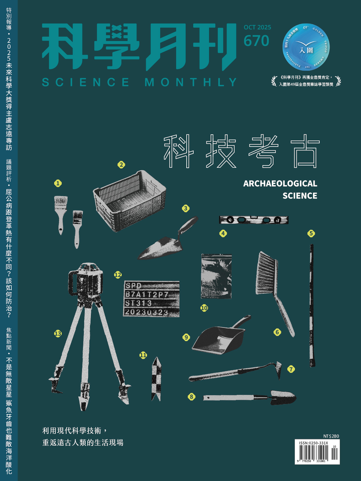 內容簡介 乘上科技考古的時光機2008 年,在西伯利亞南部的阿爾泰山脈,考古學家在一個名為丹尼索瓦的洞穴裡,發掘出一塊小小的指骨。這塊看似不起眼的化石,被送往德國馬克斯.普朗克演化人類學研究所(Max Planck Institute for Evolutionary Anthropology),由古遺傳學家帕波(Svante Pääbo)團隊進行 DNA (deoxyribonucleic acid,去氧核糖核酸)分析。經過兩年的研究,團隊發現指骨的基因組既不屬於現代人,也不同於尼安德塔人(Homo neanderthalensis),而是一個全新的古人類。團隊也因為出土地點,將此人類命名為丹尼索瓦人(Denisovans)。往後也陸續在中國青藏高原與哈爾濱等地找到丹尼索瓦人的化石。同樣在 2008 年,距離臺灣西南約 25 公里的澎湖水道,漁船在深達 60~120 公尺的海域進行捕撈作業時,意外發現一塊古人類的下顎骨化石。這塊過去沉睡海底的「澎湖 1 號」標本,經由臺灣與日本的科學家合作進行古蛋白序列分析後,於今(2025)年 4 月發表結果,證實過往被稱為澎湖原人(Homo tsaichangensis)的化石其實就是丹尼索瓦人,同時推翻了丹尼索瓦人僅活動於高海拔地區的假設。由於化石樣本有限,因此科學界對於丹尼索瓦人的分類歸屬尚無定論,但這些發現仍已為我們揭開人類演化的新面貌。帕波也因利用古遺傳學分析尼安德塔人與丹尼索瓦人的基因組,對人類演化史做出關鍵貢獻,於 2022 年獲得諾貝爾生理學或醫學獎。將時間往後拉一些,考古學不僅帶領我們追溯人類演化的脈絡,也勾起我們對於遠古生活的想像。你是否曾好奇,數千、數萬年前的人類究竟長什麼樣子?當時的人們如何互動、交易與交流?又是如何依循自然環境的資源,建立起聚落與生活秩序?要回答這些問題,除了仰賴考古學家精湛細膩的出土技術外,科技的進步也讓更多技術得以被考古學應用。現代考古已從單憑化石與器物形態的推論,逐步發展為結合古分子技術、材料科學、環境重建與數位地景分析的探索。現在,就讓我們乘坐這臺「科技考古」時光機,重返遠古。副總編輯 李依庭封面說說話封面設計以「圖鑑」的視覺形式呈現考古發掘現場常見用具,也宛如一只工具箱,象徵知識的整理與展開,為專輯揭開序幕。讀者翻開封面後閱讀文章,就如同跟隨考古學家的腳步,從發掘現場走進分析與詮釋的領域,透過跨學科的科技考古視角,一窺過去人類的生活。在此也特別感謝劉崇宇老師提供考古現場素材。