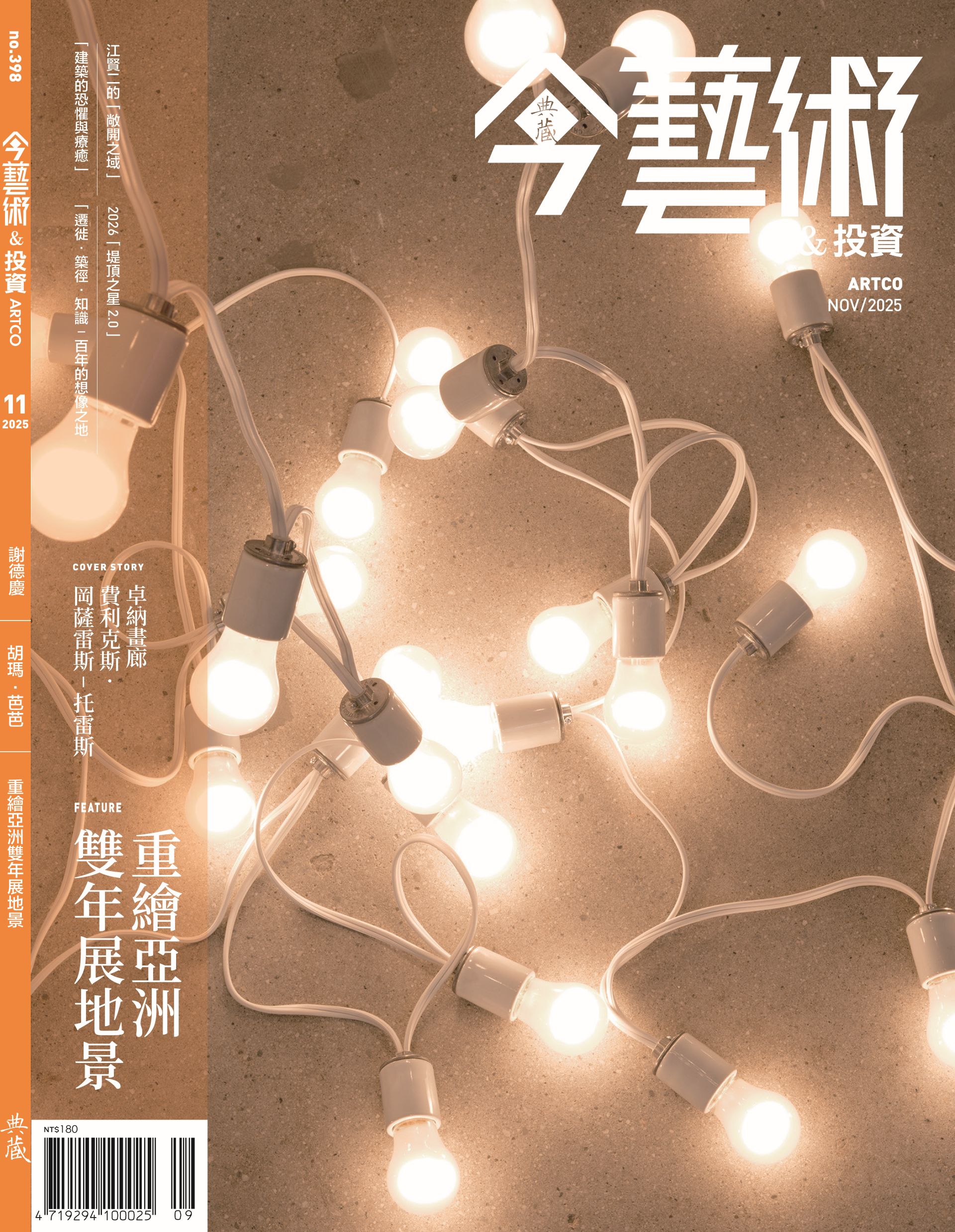 產品目錄 EDITORIAL26 世界盡頭的探問與微小光芒|朱貽安COLUMN28 去年,我成了被告——民事訴訟篇|王嘉驥30 兩度撤銷文資身分—— 「化南新村」案臺北市文化局滿臉豆花|蕭文杰32 被取消的展覽,未被取消的問題|洪三雄34 看建築.遊臺中 宜居幸福城市在望|簡秀枝MISSING PIECES36 田島正友 芳蘭之丘的藝術火苗|王德合ARTIST38 滿溢生光:江賢二的「敞開之域」|吳錦勲42 胡瑪.芭芭:迷人的恐懼之美|陳冠綸SPECIAL REPORT46 重複,不重複:當藝術以「塑形力」回應自身、社會與時代專訪 2026「堤頂之星2.0」年度策展人蔡佩桂|章郡榕48 在百年古蹟中打造「活」的框架——新竹市美術館「遷徙.築徑.知識──百年的想像之地」|章郡榕COVER STORY50 溫柔的戰術:費利克斯.岡薩雷斯-托雷斯的滲透式美學|朱貽安FEATURE56 重繪亞洲雙年展地景 現場之間的反思、共振與想像|嚴瀟瀟58 向策展人提問:再思亞洲的雙年展|嚴瀟瀟66「思慕」的多聲部合唱 山姆.巴塔維爾談2025台北雙年展的詩性與政治|嚴瀟瀟70 在日惹重探身體與萬物的連結 第18屆日惹雙年展「KAWRUH: Tanah Lelaku」的具身經驗|李京樺74 場所、系統、實踐、反思、測繪、邊界、區域: 2025愛知三年展|郭昭蘭 78 螢光地毯、黑色隧道與銀色光芒的儀式 第13屆首爾媒體城市雙年展「降靈:靈魂的技術」|葉佳蓉OBSERVATION82 在黑暗中發光的中世紀,前現代的回歸與當代啟示 「如上如下」與「烙印勇士&火之王國」|詹育杰86 歷經市場考驗的當代藝術,在壓力之下依然充滿活力|Aprice.comSPOTLIGHT90 恐懼的建築,療癒的家屋: 與策展人阮慶岳談「建築的恐懼與療癒」|章郡榕94 謝德慶:生命作品 1978–1999|王維薇ART SCENES98 繽紛記憶 林介文的織作藝術與軟雕塑|王昱心