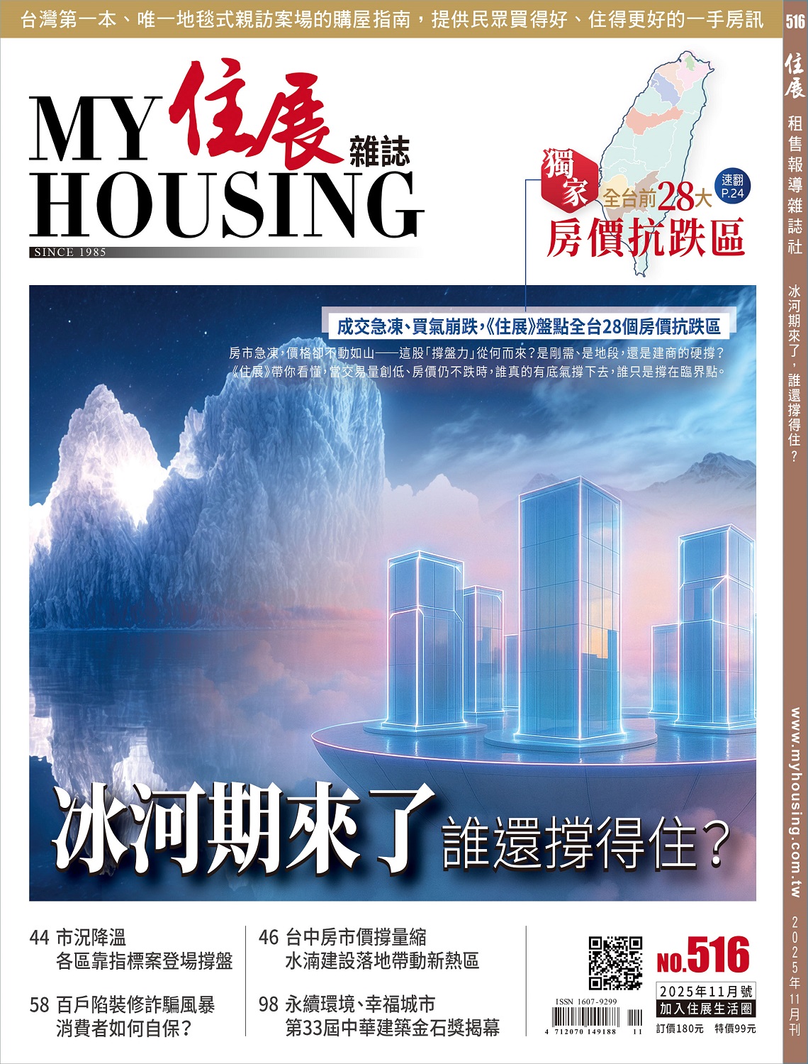產品目錄 516住展雜誌 目錄2 社論堰塞湖之後,島嶼在低語6 編輯室的話用科學找答案!8 讀者投稿好房子外,更要有好社區10 目錄14 房產大小事每月重要房產訊息16 總監看房市前三季推案量銳減逾三成 二○二五年預售績效難以從從容容20 封面故事冰河期來了,誰還撐得住? 成交急凍、買氣崩跌,《住展》盤點全台28個房價抗跌區房市急凍,價格卻不動如山──這股「撐盤力」從何而來?是剛需、是地段,還是建商的硬撐?《住展》帶你看懂,當交易量創低、房價仍不跌時,誰真的有底氣撐下去,誰只是撐在臨界點。30 想買卻貸不到!自住買方的五道新關卡34 從老公寓到小套房,銀行最怕的房子長什麼樣?四大房貸地雷與破解攻略一次看36 買房第一桶金定期定額VS單筆投資哪個好?專家揭密「微笑曲線」致勝關鍵40 人物專訪從上海崑山到台北雙星 通力靠智慧電梯搶攻台灣戰場房市直擊44▓北台灣市況降溫,各區靠指標案登場撐盤46▓中台灣台中房市價撐量縮 水湳建設落地帶動新熱區48▓南台灣房市量縮探低點 南部靠建設穩盤抗寒50 企業專訪逆風築夢 何溪明與大和的永續之路54 好宅專欄-戴雲發從地基到天際 揭開高樓建築安全結構密碼住展專欄58吳翃毅百戶陷裝修詐騙風暴,消費者如何自保?60林明忠買到瑕疵屋該不該打官司?訴訟成本恐比修繕費還高62周念暉花蓮堰塞湖潰堤,房屋責任怎麼算?64何宗翰環境全都算進去!建築設計的智慧進化66買房站哪邊裝潢主流誰稱霸?質感木作VS俐落系統櫃71 Alife 好好過生活-宜蘭縣宜蘭市特輯74 ♦人文風情76 ♦散步地圖78 ♦美食指南80 ♦商店指南 82 ♦最新市況86 ♦建案地圖87 ♦建案開箱91 居家風水拆除大圓環故事一籮筐92 空間美學山與澗 高詩杰解構重生的空間山徑98 廣告企劃永續環境、幸福城市第33屆中華建築金石獎盛大揭幕108 每月實務住展房產知識購屋漫遊110 工地總彙159 劃撥單