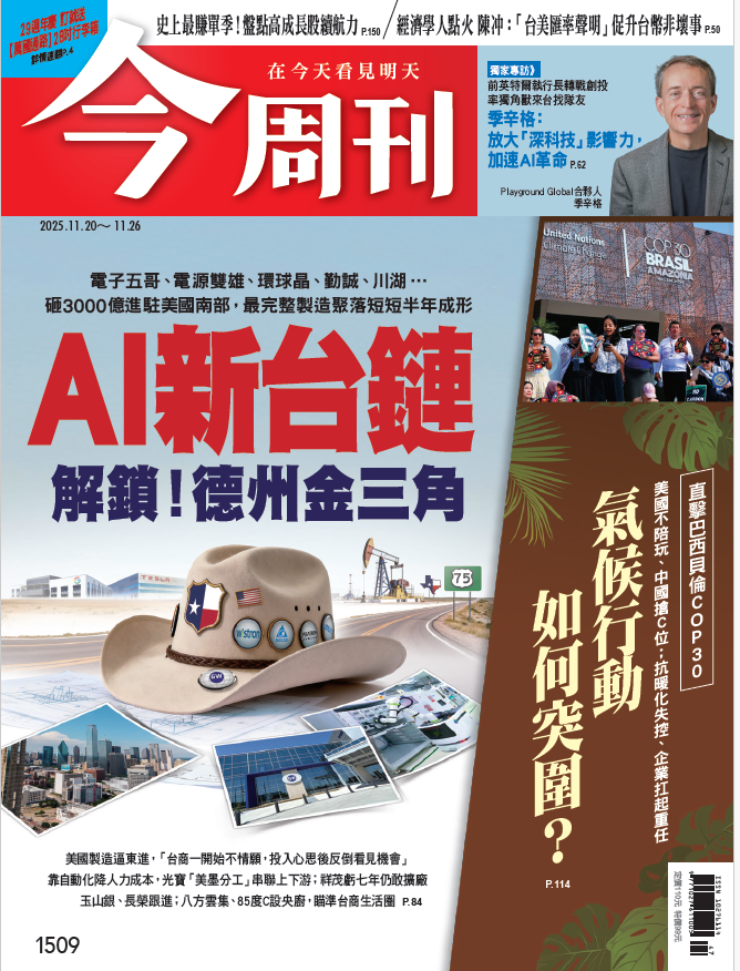 內容簡介 電子五哥、電源雙雄、環球晶、勤誠、川湖⋯砸3000億進駐美國南部,最完整製造聚落短短半年成形AI新台鏈解鎖!德州金三角美國製造逼東進,「台商一開始不情願,投入心思後反倒看見機會」靠自動化降人力成本,光寶「美墨分工」串聯上下游;祥茂虧七年仍敢擴廠玉山銀、長榮跟進;八方雲集、85度C設央廚,瞄準台商生活圈P.84………………………..……………………..………………………..………………………..右上:Playground Global合夥人 季辛格獨家專訪》前英特爾執行長轉戰創投 率獨角獸來台找隊友 季辛格:放大「深科技」影響力,加速AI革命P.62………………………..……………………..………………………..………………………..右直邊條:直擊巴西貝倫COP30美國不陪玩、中國搶C位;抗暖化失控、企業扛起重任氣候行動如何突圍?P.114置頂:史上最賺單季!盤點高成長股續航力P.150經濟學人點火 陳冲:「台美匯率聲明」促升台幣非壞事P.50