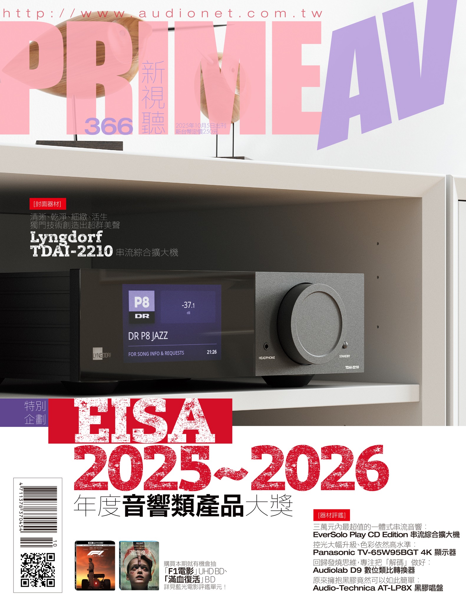 內容簡介 【內容簡介】新視聽 366精采內容【特別企劃】◎EISA2025~2026年度音響產品獎【AV BIG NEWS】◎Panasonic全新智慧顯示器正式上市【器材評鑑】◎Panasonic TV-65W95BGT 4K顯示器◎SAMPO EM-55AI3220 4K顯示器◎Lyngdorf TDAI-2210 串流綜合擴大機◎Eversolo Play CD Edition 一體式串流擴大機◎Audiolab D9 數類轉換器◎BOYUURANGE K4 Deluxe Edition 全音域喇叭◎Audio-Technica AT-LP8X 黑膠唱盤◎EAhibrid PureDC-ATV5000 Apple TV 4K改機版 + 線性電源【瘋耳機】◎Superlux HD668BMKII 耳罩式耳機◎BOSE Quietcomfort Ultra 消噪耳機第二代【特別報導】◎新竹南寮「強笙音響」開幕,以「自宅音響職人」概念提供專業級服務◎名展以TDG喇叭打造泡泡瑪特風「響唱玩聚屋」◎太順鉅業舉辦代理品牌影音應用發表會【主筆專欄】◎廖斐森:發現未來影音新視界★Optoma引領家庭劇院投影機正式邁向Dolby Vision時代,同時擁抱高亮度與廣色域的超大尺寸影像新紀元來臨◎江口洋蔥 專欄★不可能的任務:最終清算表會◎劉德湧的HV專欄★F1電影★滿血復活◎保溫冰嚼電影★奧斯卡前哨站:星光盛事,群星爭霸