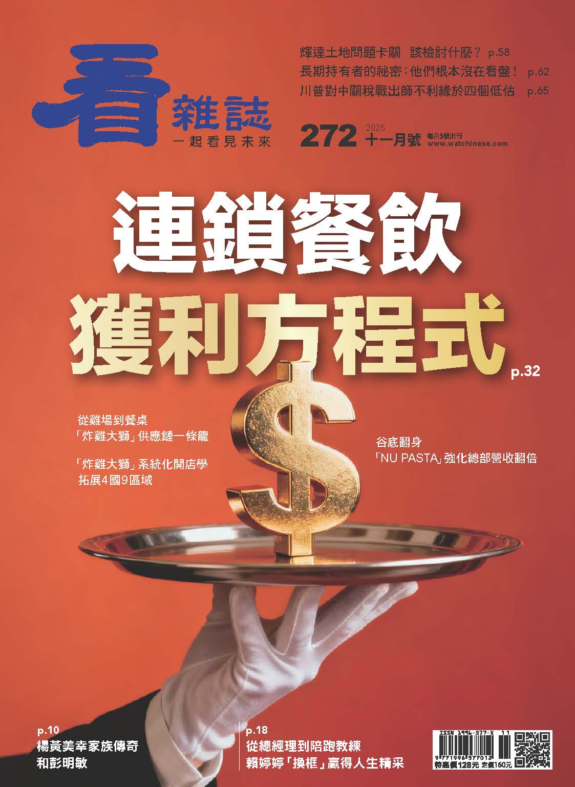 內容簡介 《看》雜誌本期內容簡介【封面故事】〈連鎖餐飲 獲利方程式〉─連鎖餐飲品牌「炸雞大獅,」利基於從雞場到門市產銷一條龍,成功打造可複製的獲利模組。曾歷經關店潮的「NU PASTA」,則透過總部強化,導入月會制度與高額獎金激勵門店,成功優化單店營收。連鎖餐飲的致勝關鍵,就在於穩健總部、數據賦能與善待加盟夥伴。【獨家評論】〈輝達土地問題卡關 該檢討什麼?〉─國策顧問、前經建會主委陳博志解讀台灣。〈長期持有者的祕密:他們根本沒在看盤!〉─台灣財經專家林茂昌別出心裁的「財經搖滾」。〈川普對中關稅戰出師不利緣於四個低估〉─旅美資深評論家何清漣深度分析國際政經局勢。【其他精彩報導】〈楊黃美幸家族傳奇和彭明敏〉─曾任中華民國無任所大使的楊黃美幸,其家族在台美之間的奮鬥歷史,以及她和彭明敏教授的師徒戰友之誼,是一副台灣人起伏跌宕的歷史縮影。〈從總經理到陪跑教練 賴婷婷「換框」贏得人生精采〉─幾經努力,賴婷婷成為「快樂、富足的人」,她也不吝分享自己的成功模式,透過《換框思維力》給有心轉變的人一根釣竿。〈人工智慧有感知 人類將失去智能統治權?〉─AII主導的「美麗新世界」裡,一個揮之不去的問題始終存在:當聊天機器人能夠像人類一樣交流、推理和行動時,它們是否也可能擁有類似人類的意識?〈從追星到「三退」 于朦朧之死點燃中國人覺醒潮〉─中國頂流男星于朦朧墜樓身亡,迅速成為中國社會集體焦慮的引爆點,成為一場圍繞「真相、權力與制度信任」的輿論風暴。〈暖暖的辣味 嫩薑與老薑〉─有著溫和辣味的薑,是許多人心目中必備的養生食材。在市場上,能夠買到的嫩薑與老薑,你知道二者的差異嗎?〈洪災無情 人間有愛 「鏟子超人」寫下台灣最動人風景〉─花蓮馬太鞍溪堰塞湖溢流,瞬間吞沒光復鄉。無數「鏟子超人」集結災區,鏟出希望、鏟出光,再度寫下善良台灣人最美麗的一頁風景。〈李後主派畫家當「狗仔」?〈韓熙載夜宴圖〉暗藏千古謎團〉─一幅披著神祕面紗的歷史名畫──南唐後主特命宮廷畫家顧閎中潛入大臣韓熙載府中「臥底」,所畫出的豪華夜宴享樂圖,目的是啥呢?【本期促銷活動】好禮1:寶藍清潔護車7件組禮盒($800),好禮2:粉紅美容潔膚6件組禮盒($880)★訂閱1年(11期特價$1,380)好禮2選1 ★訂閱2年(22期特價$2,680)2項好禮送給您。二.【看】20~40字 火力版行銷文案(門市文宣陳列用)《看》雜誌,一本綜觀世局、關心企業創新成長的經濟人文雜誌。邀請讀者「一起看見希望」。