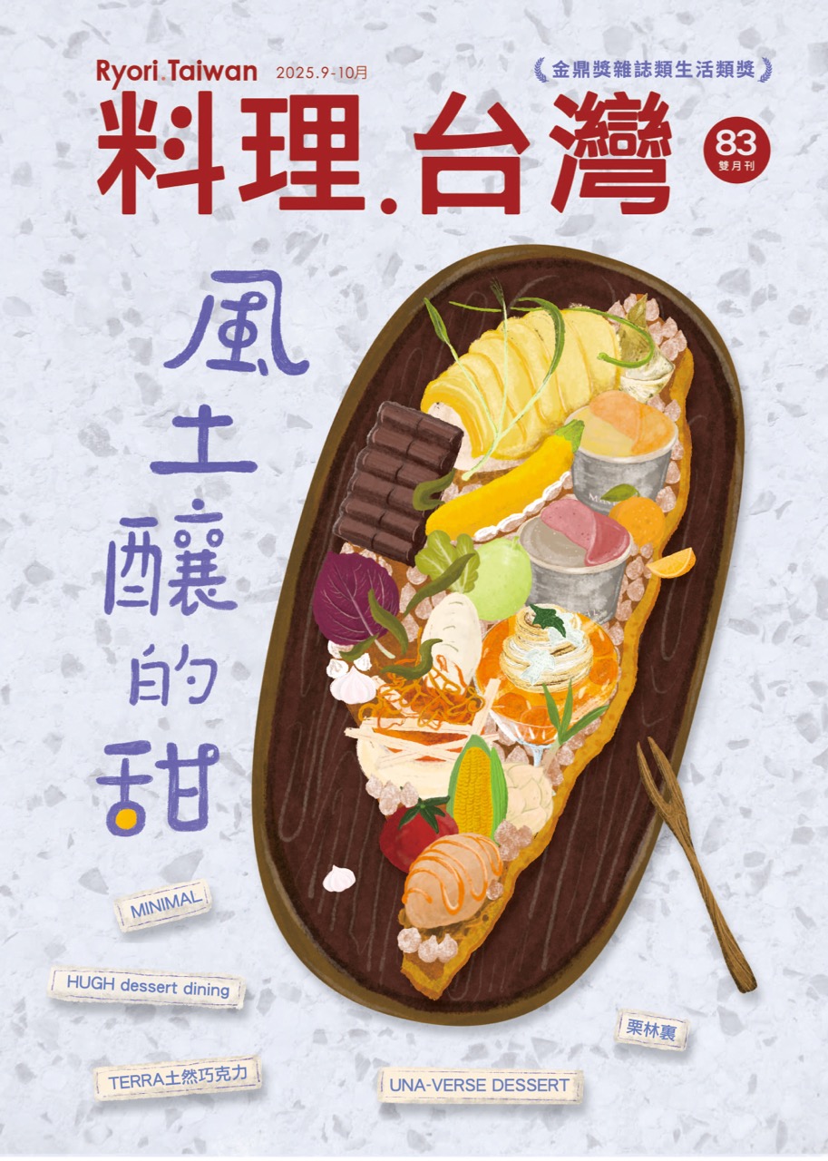 內容簡介 風土釀的甜 2014 年以降,高級、前衛,並具前瞻性與影響力的獨立餐廳,雨後春筍的成立後,飲食圈有了不同的風貌。日籍、港籍或新加坡歸國的國際名廚,重新聚焦台灣特有的優勢,掀起了一股尋找台灣味的巨大浪潮。 至今2025年,這股浪潮已經洶湧超過十年。下個十年,台灣味將被探索到哪個層面呢? 《料理台灣》專題企劃〈風土釀的甜〉由五家甜點店出發探究台灣味:熟悉法式甜點的元素以及表現形式的HUGH dessert dining、TERRA 土然巧克力、盤式甜點專門店 UNA-VERSE DESSERT、2024年拿下米其林一星的冰品店MINIMAL、主打板前甜點的栗林裏。甜點店的「台灣味」,早已超越單純將台灣在地食材加入配方的思維。• HUGH dessert dining:主廚鄭為修,在甜點盤上包餃子、綁粽子,轉化日常飲食記憶。• TERRA 土然巧克力:主廚楊豐旭,以紫蘇、東方美人茶、梅乾菜等客家元素,讓巧克力呈現細緻而深邃的層次。• UNA-VERSE DESSERT:主廚韓慧婷,從番茄切盤、燒番麥、米糕粥到綠豆椪,逐一拆解經典滋味,並在甜點盤上進行華麗重構。• MINIMAL:主廚萬士傑則希望「把生活中的感受化入冰品」,甚至包含坐在台式藤椅上的氛圍。• 栗林裏:主廚陳琮渝與張佳瑜更跨界嘗試,把關東煮化作雋永而合理的甜點表現。這一代甜點主廚們不再受限於食材本身,而是將個人記憶、地方節慶特色、台式生活風貌與情感經驗,凝聚成一道道鮮活的甜點。這,正是「台灣味」邁向下一個十年的樣貌。其他專欄〈May的食空滋味〉講述冰島鱈魚的故事,原來鱈魚對於冰島人如此重要,甚至因此引起冰島與英國間的海域戰爭,炸魚薯條比我們想像更加火藥味十足! 香港米其林三星餐廳Caprice迎來二十週年慶,〈人間探味集〉回顧了Caprice行政總廚Guillaume Galliot的事蹟,看這位大廚如何用自己獨到的跨文化味覺風土觀引領香港餐飲界的不敗食尚。 台灣巨峰葡萄有十二個產地,各產地的風味皆不同?而南投信義高品質的小農青梅,又是何故搭配冠軍茶釀造成梅侍PLUMATE的梅酒?左鎮澄山筍業竟長達百年?《料理台灣》深入台灣各地的專欄〈風土識食〉,蒐羅了這些農產與地酒的有趣故事,必不可錯過。 炎炎夏日,這一期〈台灣餐飲市場動態〉特別以手搖飲料為主題,討論逐日升級服務體驗的台灣手搖飲料市場。主打直購水果的大苑子、擁有茶園種植精品茶的60⁺ Tea Shop,以及真的在自家牧場裡養了一群牛的丹醇研選,是如何透過品牌力與食材等多管齊下,在台灣飲料戰國中靠差異化打造兼具溫度與精緻度的手搖品牌? 〈地方滋味踏查〉來到台南,穿梭在台南的巷弄之中尋找府城人的下課後點心,肉鬆麵包、生煎包、割包和南部特有的雪淇冰紅茶,每一項點心都令人懷念,不只是地方的滋味,更是台南人平凡日常的一道道溫柔風景線。 2025年的夏季尾聲,《料理台灣》83期將盤式甜點、冰淇淋、巨峰葡萄、梅酒、手搖飲或台南巷弄中的點心,集結在一起,成為精彩動人「風土釀的甜」。