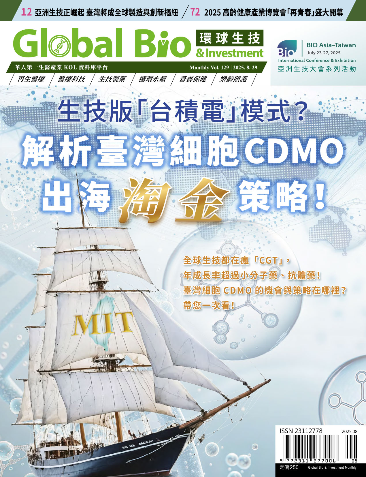內容簡介 【Cover Story | 封面故事】生技版「台積電」模式?解析臺灣細胞CDMO出海淘金策略!細胞與基因治療(CGT)狂潮已來!據估計,全球CGT市場規模將在2027年達到406億美元,CAGR達到27.2%,成長速度超過小分子藥、抗體藥,甚至是熱門的抗體藥物複合體(ADC)。CGT產品複雜性高、產程技術多樣化的特性,也帶動CGT研發將製造外包,CDMO商機水漲船高。臺灣雖有《特管辦法》為細胞製造鋪路,但真正的CDMO市場大餅,卻仍在國際賽局之中。如何突破國內市場侷限、勇敢出海,大啖商機?專家點出,臺灣的細胞治療CDMO,有機會成為「下一個台積電」,但如何能再創臺灣專業代工新高峰?本刊盤點16家廠商、解析7家指標性細胞CDMO策略,帶您看臺灣細胞治療CDMO廠如何結盟,突圍出海!【Special Report | 特輯】2025 BIO Asia-Taiwan特輯:亞洲生技正崛起 臺灣將成全球製造與創新樞紐一年一度的亞洲生技盛事⸺2025亞洲生技大會於7月23日至27日盛大舉行!今年以「掌握亞洲生技新契機」為主題,從南港展覽館一路延伸至生醫園區參訪,橫跨9天,匯聚全球生技菁英。值得關注的是,大會延續「創新科技、投資高峰、區域合作」三大論壇架構,規劃3場主題論壇與12 場創新論壇,更首度整合「國家生技研究園區Demo Day」及「比翼×北醫×秀傳Demo Day」兩大扶持生醫新創活動,全力助攻臺灣生醫產業邁向國際舞台!從國際舞台的展示交流,到臨床應用的落地實踐、再到資金、生態鏈,全面展現臺灣正加速走向「全球製造與創新樞紐」的企圖心。在亞洲生技力量崛起之際,臺灣如何把握契機、強化國際能見度,已成產業界與政策端的共同課題。本刊將在特輯中完整呈現觀點、對話與解析。【Industry | 產業趨勢】從傳統CRO一路蛻變為創新加速器麥德凱生科20週年盛會 聚焦AI×CIO再啟國際化新篇20年2005年成立的麥德凱生科(MDG)在亞洲生技大會期間的7月23日,於國立臺大醫院國際會議中心盛大舉辦20週年慶,以「從CRO到CIO,引領臺灣廠商挺進國際市場」為主題,匯聚超過150位來自日本、臺灣產官學界人士舉辦論壇,一起見證麥德凱20年從CRO轉型進化為共創型創新加速器(CIO)、「MIT原料×MIJ產品」的跨境創新路徑,成功將臺灣研發的健康素材推向國際舞台。商學院資源加持、推動生技CEO再進化政大EMBA臺灣未來大健康產業領袖搖籃!以商學院豐厚資源與國際連結著稱的政大EMBA,於2014年成立「生技醫療組」,專為打造跨領域大健康產業高階人才。課程融合商業管理理論與產業案例,涵蓋策略、智慧財產權、ESG、數位轉型等未來領袖必備知識等主題,並結合跨組選修與國際參訪,協助學員掌握全球趨勢。政大EMBA表示,透過專業課程與跨界交流,讓不同背景的CEO與專業經理人為自己加值,以推動企業成長並發揮正向影響力。更多全球產業資訊、專家觀點皆在《環球生技期刊》Vol.129