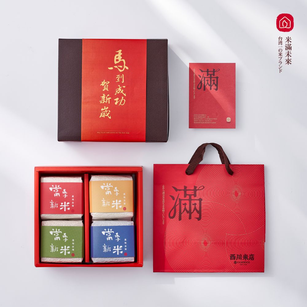 內容簡介 - 低碳環保、支持公益永續的春節禮盒 -春節禮盒均符合ESG永續發展指導原則,落實聯合國SDGs永續發展目標。⭕環境保護:春節禮盒將環保理念,融入包裝設計每一處細節禮盒的包裝採模組化設計,採用減少印刷油墨與裝飾、可回收重複利用的紙盒。榮獲114年環境部的綠意匠心環保禮盒評比大賞「包裝綠色設計企業獎」,從一粒米的誕生,到每份禮盒的誠意,我們用綠色設計實踐對土地的承諾。西川米店以友善環境的設計,讓每一份心意,成為對地球最溫柔的祝福。⭕低碳足跡:支持在地生產者春節禮盒選用台灣在地農特產品,以實際行動支持在地生產者。商品獲得農業部農村發展及水土保持署【山守現證明標章】認定,守護農村、協助傳承與創新。⭕社會責任:送禮還能做公益我們長期與瑪利亞社會福利基金會攜手合作,以有償的方式邀請身心障礙者共同參與春節禮盒包裝工作,為慢飛天使提供正向實質的幫助。許多人會選擇直接捐款的方式,來為公益團體提供幫助。但是,跟隨瑪利亞基金會創辦人—莊宏達醫師「重視每一個生命」的理念,以合作的方式提供包裝工作,希望讓慢飛天使們感受到自己不再是只能被照顧的角色,而是能夠參與、能夠為家人、社會付出的一份子,也為他們提供永續且更實質的幫助。- 以好米迎好年,讓幸福從開飯那一刻開始延續 -嚴選的四款米禮盒,象徵一年四季五穀豐登,送禮份量十足、心意更是滿滿,搭配多款新春吉祥話包裝,既喜氣又體面,展現誠摯祝福。⭕一等越光米|台日之光,頂級好米源自日本、在本土落地生根的優質越光米品種—台南16號米粒晶瑩飽滿,口感Q彈具有黏性、細嚼甘甜自然、清雅迷人的淡淡米香。✨品質最佳的一等米越光米,新鮮、顆粒飽滿有光澤,浸透陽光溫暖香氣,單吃就很好吃!✨適合搭配各種日式料理,冷掉也能保持口感扎實、Q彈,許多壽司職人都會選用越光米來製作壽司醋飯。⭕豐曦香米|沐浴曙光的豐收之米來自花東縱谷,這片蘊藏山川能量的純淨之地。每年在曙光下孕育出的優質好米,象徵著豐收與希望。祝福對方未來像陽光一樣燦爛美好、收穫滿滿。✨外觀或許不像其他品種晶瑩剔透,但有著和花東一樣的自然美。✨米飯吃起來Q黏富有口感,咀嚼時能感受到自然的米香,是日本人都超愛吃的米。✨不論是冷飯還是熱飯,都能保持飽滿的口感,非常適合用來做日式炊飯、蓋飯、飯糰等料理。⭕花東糙米|未經雕琢的,花東好米來自花東縱谷,台灣最純淨無污染的稻米產區保留了米的完整營養,璞質純粹的糙米。傳遞最真摯、純粹的祝福。✨外觀飽滿,散發自然米香。口感QQ彈牙富有口感的特性,能讓人細細品味。✨非常適合搭配各式燉煮料理,不僅保留美味,還能增加營養,味蕾與健康兼顧。⭕冬韻紫米|滋補強身的帝王貢米特選富含營養、香氣濃郁,生長時間長的台灣在地冬收紫米,外觀秈長黑亮,有著天然花青素。在古代,因產量稀少、滋補強身,是專門進貢給帝王的養生米將象徵富貴與長壽的紫米送給長輩,傳遞最好的祝福。✨煮好後濃郁的紫米香氣撲鼻而來,口感軟黏且有淡淡甘甜。✨不論搭配紅豆、桂圓或椰汁都非常適合,如紅豆紫米粥、芋頭紫米糕、紫米珍珠丸子等甜食糕點。- 提供春節禮盒客製化服務 -我們提供多元的春節禮盒客製化服務,讓您一款禮盒,滿足多樣的春節送禮需求。⭕打造專屬送禮客戶的春節禮盒客製春節禮盒內容物可自由更換,送禮給一般客戶、VIP客戶都沒問題、吃葷吃素也都OK。⭕協助搭配符合預算的春節禮盒客製化春節禮盒還可以根據您的採購預算,由專人協助您搭配出符合預算的春節送禮方案。⭕幫助提升品牌形象的春節禮盒馬年禮盒可以根據公司企業需求,提供春節禮盒包裝、禮盒腰封、賀卡、品牌logo印製、代貼名片等服務,為企業品牌形象加分。😀禮合,⼈就和將心意,化作清爽無負擔的健康新選擇!西川米店是家族已經經營超過四十年的傳統店鋪,位於台中市半平厝的西川里。我們與台灣各產區的稻農合作,選擇最優質的米,手工包裝成各種年節禮盒,包括喜米、彌月米禮盒等,以提供給顧客們。店裡充滿了家的味道和溫暖,我們致力於保持傳統的手工製作方式,讓顧客感受到濃濃的人情味。除了實體店鋪外,我們也在線上平台提供客製化的米禮服務,讓更多人能夠享受到我們的產品。❣️⽤⼼,更安⼼從產地到包裝,每個環節都細細把關。⻄川米店期待能將您的每份⼼意~完美交付春節禮盒|商品詳情*產地|台灣*內容物|越光米、豐曦香米、花東糙米、冬韻紫米*各1包,滿字提袋*1只*保存天數|米:180天*保存方式|開封後需冷藏,以保新鮮。 *包裝重量|越光米、豐曦香米、花東糙米500克 包,冬韻紫米480克 包*禮盒尺寸|長24公分 × 寬22.5公分 × 高8.6公分