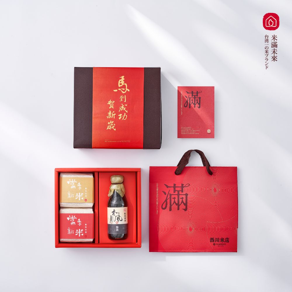內容簡介 - 低碳環保、支持公益永續的春節禮盒 -春節禮盒均符合ESG永續發展指導原則,落實聯合國SDGs永續發展目標。⭕環境保護:春節禮盒將環保理念,融入包裝設計每一處細節禮盒的包裝採模組化設計,採用減少印刷油墨與裝飾、可回收重複利用的紙盒。榮獲114年環境部的綠意匠心環保禮盒評比大賞「包裝綠色設計企業獎」,從一粒米的誕生,到每份禮盒的誠意,我們用綠色設計實踐對土地的承諾。西川米店以友善環境的設計,讓每一份心意,成為對地球最溫柔的祝福。⭕低碳足跡:支持在地生產者春節禮盒選用台灣在地農特產品,以實際行動支持在地生產者。商品獲得農業部農村發展及水土保持署【山守現證明標章】認定,守護農村、協助傳承與創新。⭕社會責任:送禮還能做公益我們長期與瑪利亞社會福利基金會攜手合作,以有償的方式邀請身心障礙者共同參與春節禮盒包裝工作,為慢飛天使提供正向實質的幫助。許多人會選擇直接捐款的方式,來為公益團體提供幫助。但是,跟隨瑪利亞基金會創辦人—莊宏達醫師「重視每一個生命」的理念,以合作的方式提供包裝工作,希望讓慢飛天使們感受到自己不再是只能被照顧的角色,而是能夠參與、能夠為家人、社會付出的一份子,也為他們提供永續且更實質的幫助。- 米滿豐收財庫滿,醬油沾沾好運來 -嚴選花東的花東糙米與豐曦香米,一白一糙,象徵「圓滿與健康」,以兩包實在份量裝入禮盒,搭配多款吉祥話包裝,送禮大方又應景;而醬油是家庭共享的調味品,象徵著分享、團圓和彼此關愛。俗話說:「沾一點醬油,沾一點福氣」,送米醬油禮盒,不僅實用還有喜氣又吉利的好寓意,更傳達了送禮者與祝福。⭕和風醬油|瑞春人氣NO1日式風味醬油嚴選在地百年老字號品牌瑞春醬油的日式風味醬油,結合了傳統釀造醬油的濃郁與柴魚的鮮美,具有特殊的風味,而且不含防腐劑、色素等添加物,是超人氣的百搭調味品!✨柴魚醬油獨特的甘甜,非常適合用來提升料理鮮味,能讓菜餚呈現出豐富的層次。✨適合各式日式輕食料理,如:日式風味涼麵、搭配海鮮類鍋物。⭕豐曦香米|沐浴曙光的豐收之米來自花東縱谷,這片蘊藏山川能量的純淨之地。每年在曙光下孕育出的優質好米,象徵著豐收與希望。祝福對方未來像陽光一樣燦爛美好、收穫滿滿。✨外觀或許不像其他品種晶瑩剔透,但有著和花東一樣的自然美。✨米飯吃起來Q黏富有口感,咀嚼時能感受到自然的米香,是日本人都超愛吃的米。✨不論是冷飯還是熱飯,都能保持飽滿的口感,非常適合用來做日式炊飯、蓋飯、飯糰等料理。⭕花東糙米|未經雕琢的,花東好米來自花東縱谷,台灣最純淨無污染的稻米產區保留了米的完整營養,璞質純粹的糙米。傳遞最真摯、純粹的祝福。✨外觀飽滿,散發自然米香。口感QQ彈牙富有口感的特性,能讓人細細品味。✨非常適合搭配各式燉煮料理,不僅保留美味,還能增加營養,味蕾與健康兼顧。- 提供春節禮盒客製化服務 -我們提供多元的春節禮盒客製化服務,讓您一款禮盒,滿足多樣的春節送禮需求。⭕打造專屬送禮客戶的春節禮盒客製春節禮盒內容物可自由更換,送禮給一般客戶、VIP客戶都沒問題、吃葷吃素也都OK。⭕協助搭配符合預算的春節禮盒客製化春節禮盒還可以根據您的採購預算,由專人協助您搭配出符合預算的春節送禮方案。⭕幫助提升品牌形象的春節禮盒馬年禮盒可以根據公司企業需求,提供春節禮盒包裝、禮盒腰封、賀卡、品牌logo印製、代貼名片等服務,為企業品牌形象加分。😀禮合,⼈就和將心意,化作清爽無負擔的健康新選擇!西川米店是家族已經經營超過四十年的傳統店鋪,位於台中市半平厝的西川里。我們與台灣各產區的稻農合作,選擇最優質的米,手工包裝成各種年節禮盒,包括喜米、彌月米禮盒等,以提供給顧客們。店裡充滿了家的味道和溫暖,我們致力於保持傳統的手工製作方式,讓顧客感受到濃濃的人情味。除了實體店鋪外,我們也在線上平台提供客製化的米禮服務,讓更多人能夠享受到我們的產品。❣️⽤⼼,更安⼼從產地到包裝,每個環節都細細把關。⻄川米店期待能將您的每份⼼意~完美交付春節禮盒|商品詳情*產地|台灣*內容物|豐曦香米、花東糙米各*1包,和風醬油*1罐、滿字提袋*1 *保存天數|米:180天,和風醬油:未開封2年 *保存方式|開封後需冷藏,以保新鮮。 *包裝重量|豐曦香米、花東糙米500克 包,和風醬油250毫升 罐 *禮盒尺寸|長24.5公分 × 寬22.5公分 × 高8.6公分