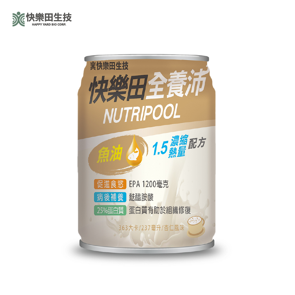 內容簡介 商品名稱快樂田全養沛魚油1.5濃縮熱量配方(葷食 杏仁風味)主要成份水、麥芽糊精、蔗糖、乾酪素鈉、芥花油、乾酪素鈣、乳清蛋白、水解小麥蛋白(含麩醯胺酸)(小麥蛋白、檸檬酸)、難消化性麥芽糊精、果寡糖、魚油[魚油、維生素E(抗氧化劑)]、大豆卵磷脂、綜合礦物質[碳酸鈣、重酒石酸膽鹼、氧化鎂、麥芽糊精、葡萄糖酸鋅、焦磷酸鐵、鉻酵母(非活性酵母、三氯化鉻)、硒酵母、葡萄糖酸錳、鉬酵母、葡萄糖酸銅、碘化鉀]、杏仁香料、脂肪酸甘油酯(脂肪酸甘油酯、檸檬酸)、氯化鉀、牛奶香料、綜合維生素[糊精、維生素C、阿拉伯膠、維生素E、菸鹼醯胺、本多酸鈣、維生素B1、維生素A脂肪酸酯油溶液、維生素B6、維生素B2、L-抗壞血酸鈉(抗氧化劑)、葉酸、脂肪酸山梨醇酐酯、米糠油、檸檬酸鈉、脂肪酸甘油酯、維生素E(抗氧化劑)、檸檬酸、維生素D3、維生素B12]、維生素C、磷酸氫二鈉(無水)、牛磺酸、鹿角菜膠(鹿角菜膠、葡萄糖)、維生素B1、維生素K1(阿拉伯膠、維生素K1、蔗糖)、生物素、維生素B12過敏原資訊本產品含有魚類製品、含麩質之穀物製品、牛奶製品及大豆製品熱量分布蛋白質提供25%、脂肪提供30%、碳水化合物提供45%容量 規格 237ml 罐,24罐*1箱食用方法 每日建議飲用1罐,特殊情況者,請依循醫師或營養師之指示調整使用量。即開即飲,使用前請充分搖勻並儘速飲用完畢。產地 台灣保存期限 15個月 (未開封)保存方法 未開罐前請存放於陰涼乾燥處,開罐後請儘速飲用完畢,若有未飲用完的部分,請密封加蓋冷藏,並於24小時內飲用完畢。可常溫或冰涼使用,如需溫熱使用,請隔水加熱,勿煮沸以免高溫破壞營養成分。注意事項 1. 本品含多種營養素,長時間放置偶有沉澱情形,開罐前請充分搖勻2. 溫熱使用後,隔餐勿食