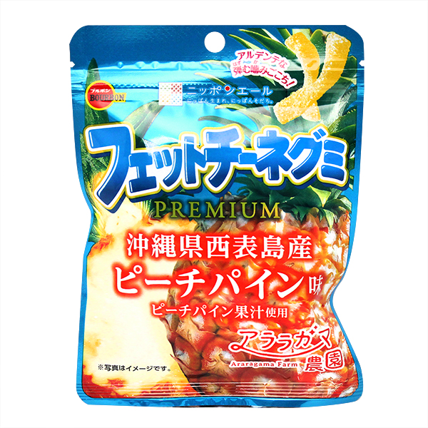 | 成分 / | 砂糖,水飴,甜味劑(赤藻糖醇),鳳梨果汁,明膠(豬皮萃取物),調味劑(檸檬酸,檸檬酸鈉,DL-蘋果酸鈉,DL-蘋果酸),碳酸鈣,香料,粘稠劑[果膠(檸檬,萊姆,葡萄柚由來)],乳化劑(脂肪酸甘油酯), 食用色素(杜沙藻胡蘿蔔素). |