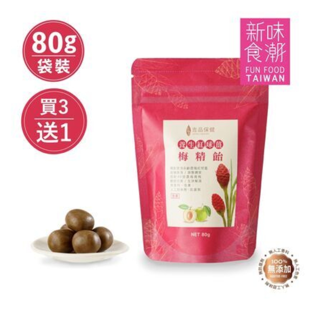 商品描述 | 【吉品保健】紅球薑梅精飴80克±3%(袋裝)(買3送1):豐富有機酸與植化素鹼回好健康獨家使用永齡紅球薑調整體質營養補給富含有機酸和多種礦物質促進新陳代謝新鮮青梅濃縮梅精 |