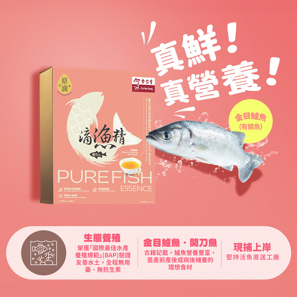 | 簡介 / | 【余仁生】滴魚精(鱸魚):•純淨無汙染場域:友善水土全程無毒,堅持不用藥,無抗生素、動物用藥、賀爾蒙、除草劑•環環相扣:低密度半海水生態養殖,從捕撈開始重視冷鏈, |