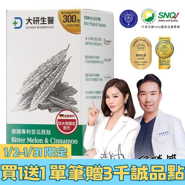 | 商品描述 | 大研生醫 德國專利苦瓜胜肽膠囊 60粒:頂規專利|全台唯一德國專利苦瓜胜肽,輕鬆戰穩好體質。子彈倍速|刷新濃度極限!300倍活性苦瓜胜肽強效登場。效果領先|全球高規格 |