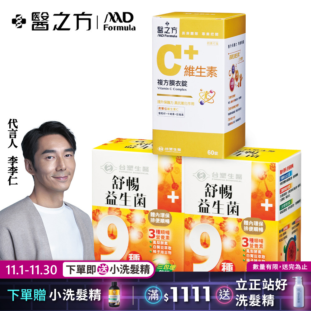 內容簡介 商品名稱: 【台塑生醫】舒暢益生菌(30包入 盒) 2盒 組內容量(g ml): 30包 盒(每包4克)保存方式: 請置於陰涼乾燥處,避免日光直射、高溫、潮濕,以維持產品品質。食用方法及用量:每日一包,為配合食物消化而達產品之最佳功效,請任選午餐或晚餐後1小時食用為佳,請搭配200-250c.c.冷開水食用(水溫需40度C以下),多食無益。內容物成分: 乳酸菌粉(乳糖、Bifidobacterium bifidum、Bifidobacterium lactis、Bifidobacterium longum、Lactobacillus acidophilus、Lactobacillus casei、Lactobacillus plantarum、Lactobacillus rhamnosus、Lactobacillus sporogenes 、Lactococcus lactis subsp. lactis)、氧化鎂、D-山梨醇(甜味劑)、乳糖醇(甜味劑)、寡糖(異麥芽寡糖、果寡糖)、果汁粉(蘋果濃縮汁、麥芽糊精、樹薯澱粉、DL-蘋果酸、檸檬酸、香料、ß-胡蘿蔔素)、脫脂奶粉、糖粉、檸檬酸、鳳梨酵素、香料、白腎豆萃取(白鳳豆)、維生素C、柿子抽出物食品添加物: 無營養標示:(每一份量4.0公克) 熱量11.6大卡,蛋白質0.2公克,脂肪0公克,飽和脂肪0公克,反式脂肪0公克,碳水化合物2.7公克,糖0.8公克,鈉3毫克原產地: 台灣製造 進口商名稱: 台塑生醫科技股份有限公司製造 進口商電話號碼: 0800-211168製造 進口商地址: 台北市敦化北路201號前棟5樓商品保存期限: 2年販售商廠商名稱: 灝翎國際有限公司販售商地址:桃園市中壢區龍昌路180巷20號販售商電話號碼:03-4564488其他揭露事項:販售商食品業者登錄字號: H-180718835-00000-5製造 進口商食品業者登錄字號:A-180539426-00000-5注意事項: 3歲以下小孩,請先洽詢醫師或藥師再行食用,本產品含有牛奶及其製品商品名稱:【台塑生醫】維生素C複方膜衣錠(60錠 瓶)內容量(g ml): 814毫克 錠 ; 60錠 瓶保存方式: 請置於陰涼乾燥處,避免陽光直射。食用方法及用量:每日1次,每次1~2錠,搭配冷開水餐後食用。一日請勿超過2錠(請依建議量食用,多食無益)內容物成分: 維生素C(維生素C、玉米澱粉)、玉米糖漿粉、乳糖、葡萄籽萃取物(葡萄籽萃取物、麥芽糊精)、卡姆果粉(卡姆果粉、麥芽糊精)、玫瑰果粉、硬脂酸鎂、聚乙烯吡咯烷酮其他成份:羥丙基甲基纖維素、二氧化鈦、食用黃色四號、食用黃色五號其他成份: 無營養標示: (每一份量1錠) 維生素C 500毫克其他成份營養標示:(每一份量1錠)葡萄籽萃取物 20毫克,卡姆果粉(含維生素C )15毫克,玫瑰果粉(含維生素C )15毫克原產地: 台灣製造 進口商名稱: 台塑生醫科技股份有限公司製造 進口商電話號碼: 0800-211168製造 進口商地址: 台北市敦化北路201號前棟5樓商品保存期限: 2年(係指在未開封狀態且正常條件下之保存)販售商廠商名稱: 灝翎國際有限公司販售商地址:桃園市中壢區龍昌路180巷20號販售商電話號碼:03-4564488其他揭露事項:販售商食品業者登錄字號: H-180718835-00000-5製造 進口商食品業者登錄字號:A-180539426-00000-5注意事項:1.本產品含有乳糖2.請小心吞食,避免孩童自行取用,開封後請確實蓋緊,並請盡速於3個月內食用完畢