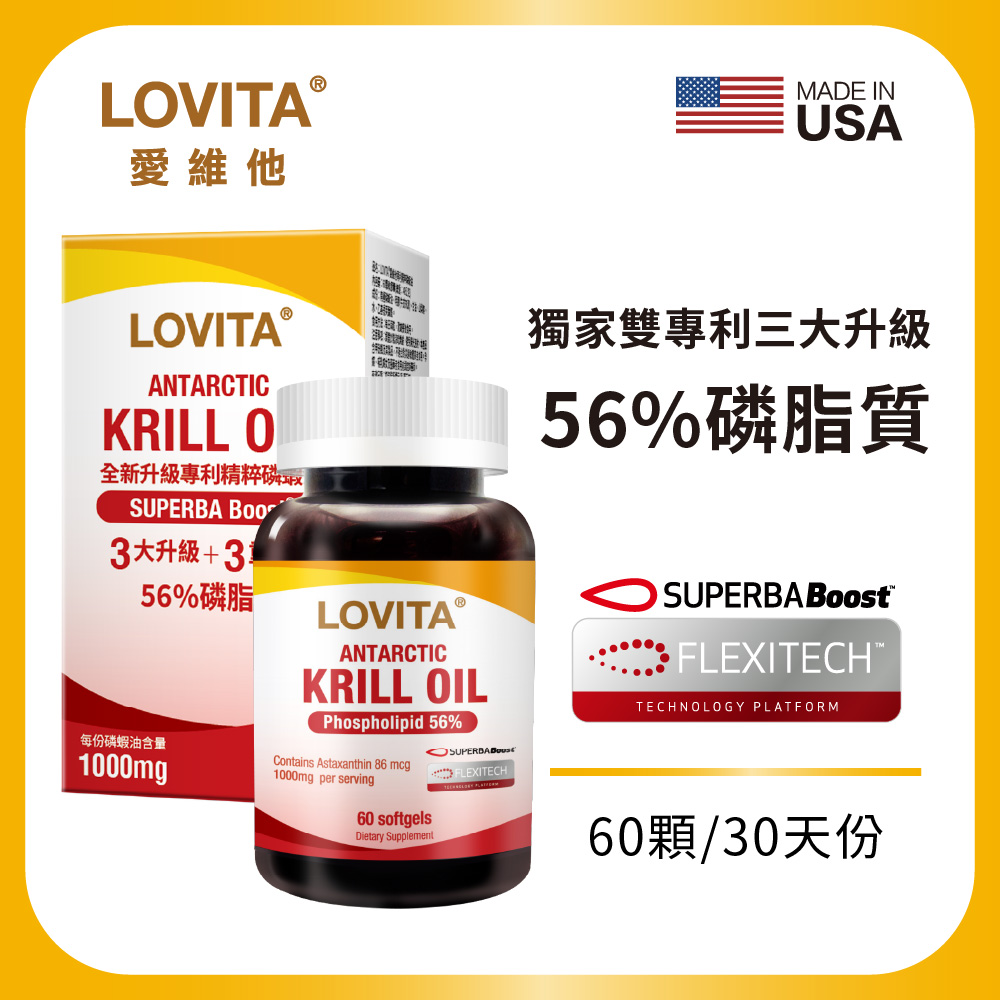 | 商品描述 | LOVITA愛維他 專利精粹磷蝦油(60顆):磷蝦油的關鍵在磷脂質◎來自挪威純淨南極海域,全球磷蝦油領導品牌AkerBioMarine出品◎專利FLEXITECH™技術提煉,保留高濃度56%磷脂型 |