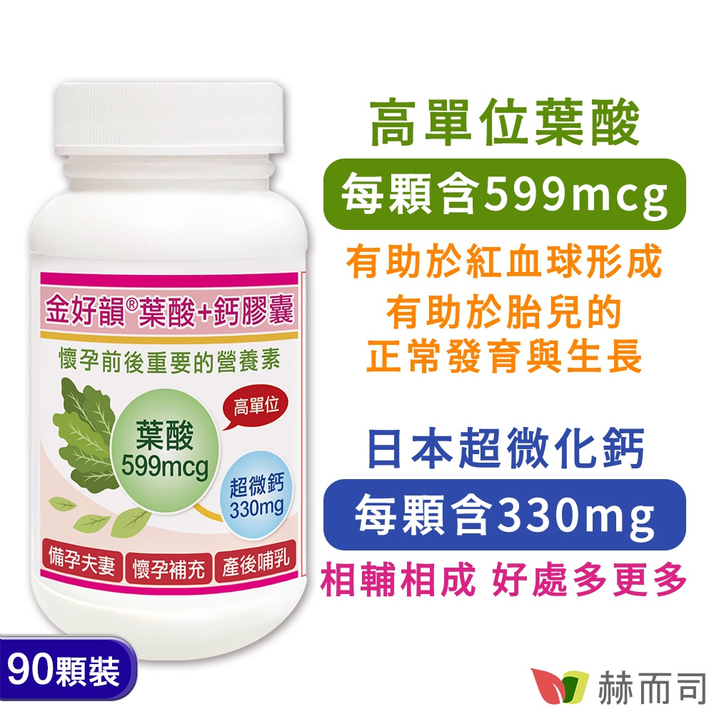 商品描述 | 【赫而司】金好韻®葉酸+鈣膠囊(90顆*1罐)備孕孕前補養配方葉酸+鈣:●孕前補養好運報到,懷孕哺乳好夥伴●每顆含有高單位葉酸599mcg+日本超微化天然鈣粉132mg●葉酸有助胎 |